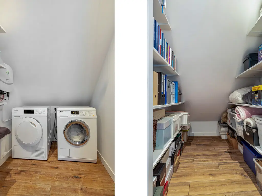 De wasruimte heeft plaats voor wasmachine, droger en de omvormer van de zonnepanelen, terwijl de CV-ruimte en inloopkast extra praktisch gemak toevoegen.