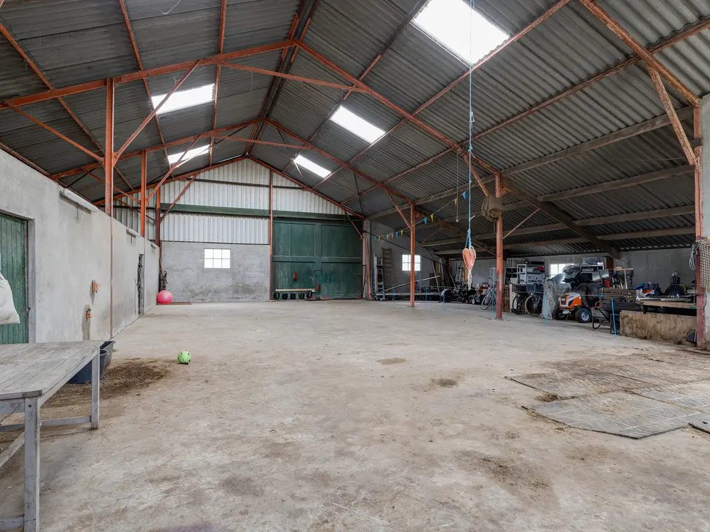 Achter de woning bevindt zich de imposante loods/schuur van ruim 380 m², thans ingericht als paardenstal. De betonnen vloer, brede toegangsdeuren en vrije hoogte maken deze ruimte geschikt voor talloze doeleinden: paardenstalling, caravan- of camperopslag, hobbyruimte of werkplaats.