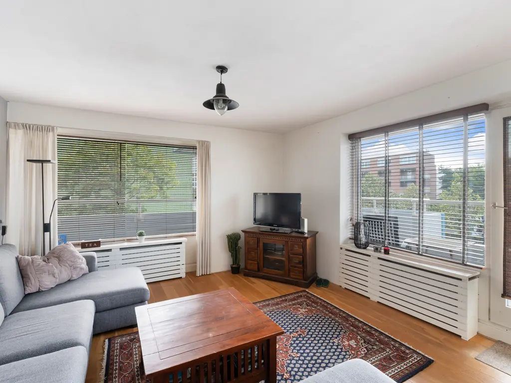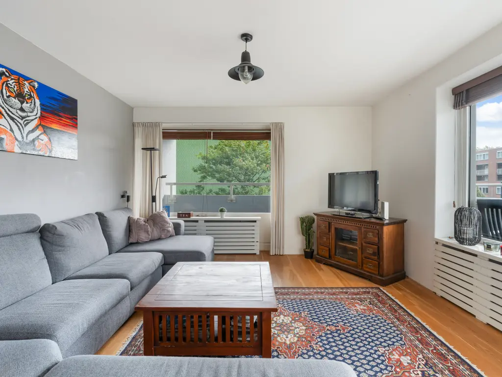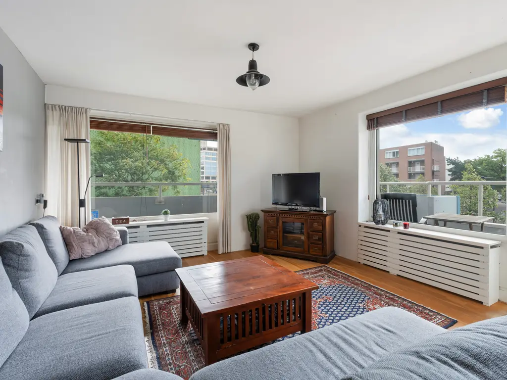 Bij binnenkomst in de hal treffen we direct rechts de riante woonkamer met aangrenzend de half open keuken. Vanwege de gunstige ligging op de hoek zijn er raampartijen rondom en treed er lekker veel licht de woonkamer in. De mooie houten vloer zorgt voor een warme uitstraling in deze mooie woonkamer. Vanuit de woonkamer kun je ook het op het zuiden gelegen balkon bereiken. Hier geniet je heerlijk van de zon!