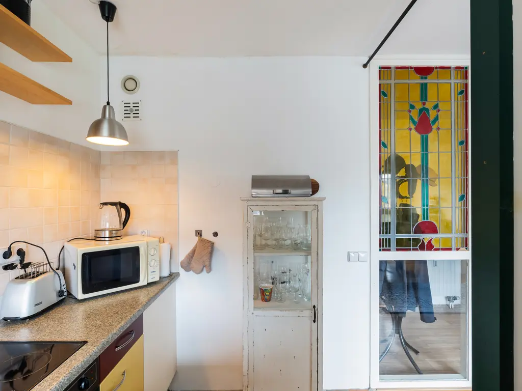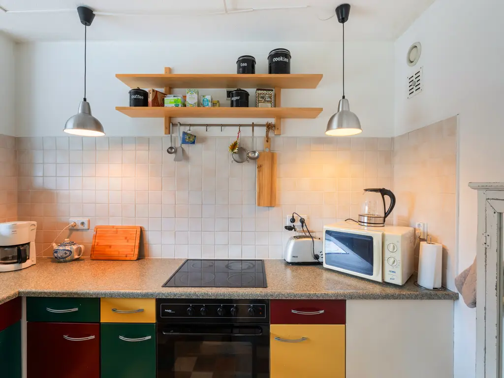 Vanuit de keuken, welke is voorzien van inbouwapparatuur, hou je contact met de eethoek via het barretje.
