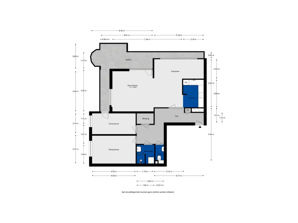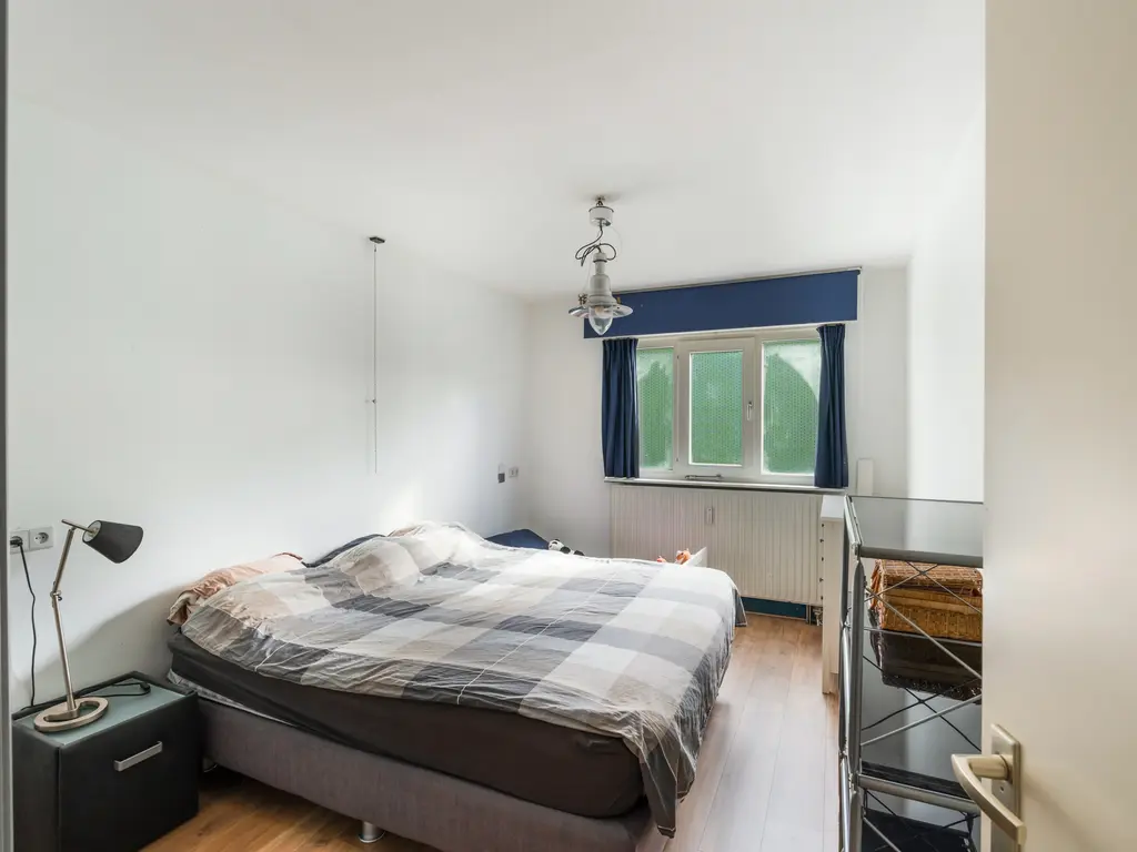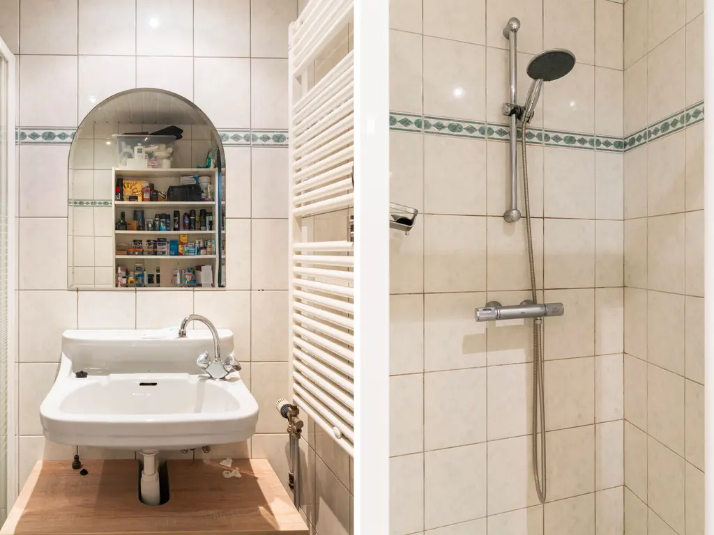 Terug in de hal treffen we nog het toilet en de naastgelegen badkamer (met wasmachine aansluiting). Ook vinden we hier een handige berging/voorraadkast. Achterin de hal bevinden zich de twee slaapkamers (13m² en 10m²) waarvan de kleinere kamer ook nog toegang biedt tot het balkon.