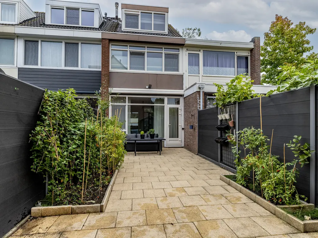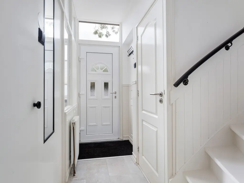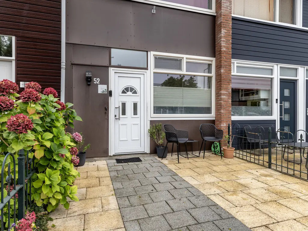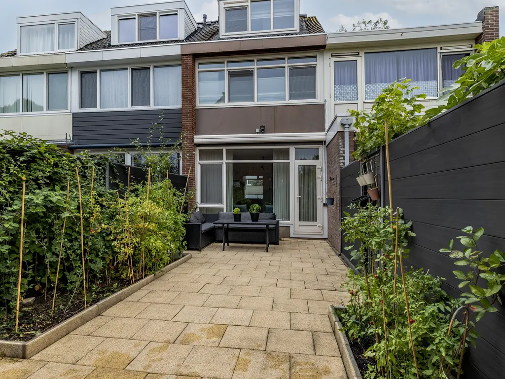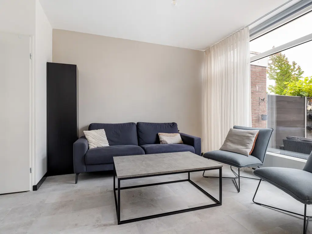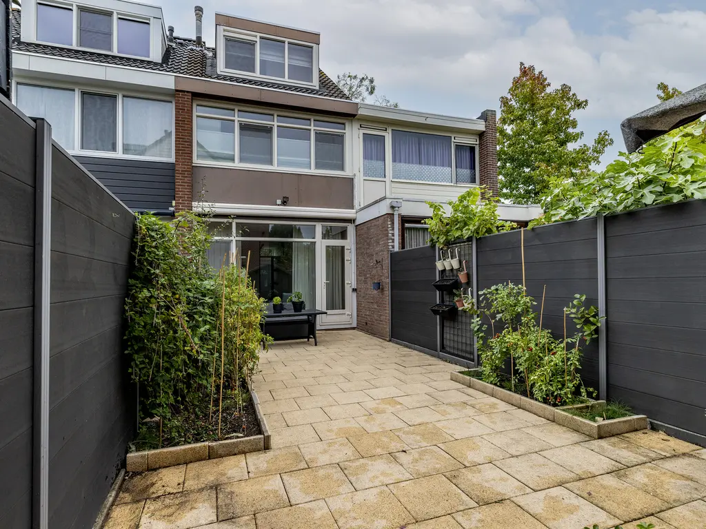 Door de voortuin kom je bij de voordeur. Naast de voordeur is er een kleine berging. Eenmaal binnen, sta je in de hal. Deze biedt toegang tot de woonkamer, toilet en de trapopgang. In de hal is er ook een glazen doorkijk raam naar de keuken. De woonkamer is tuingericht. De achtertuin is maar liefs 10 meter lang.