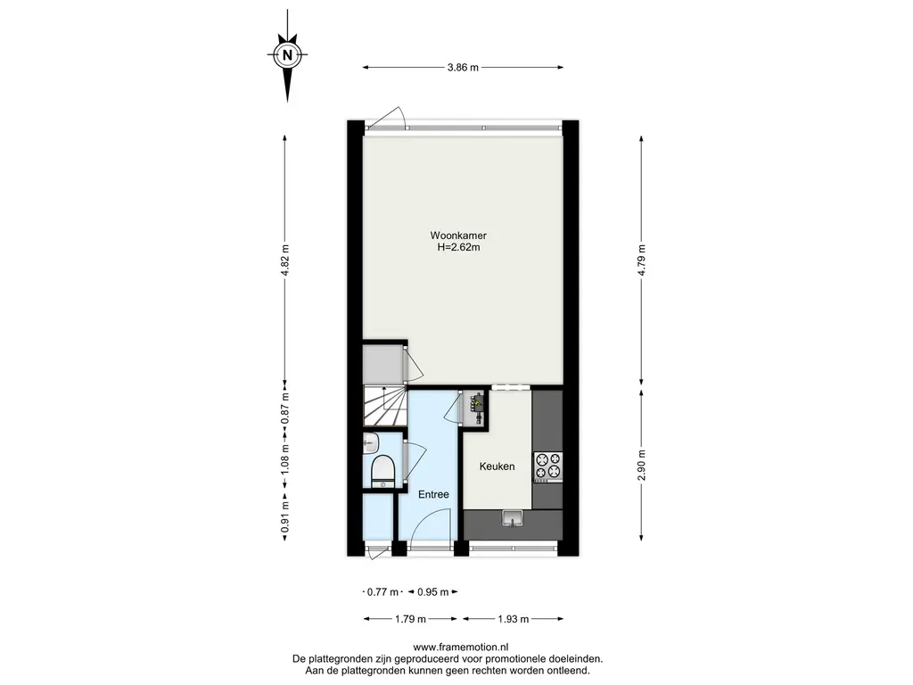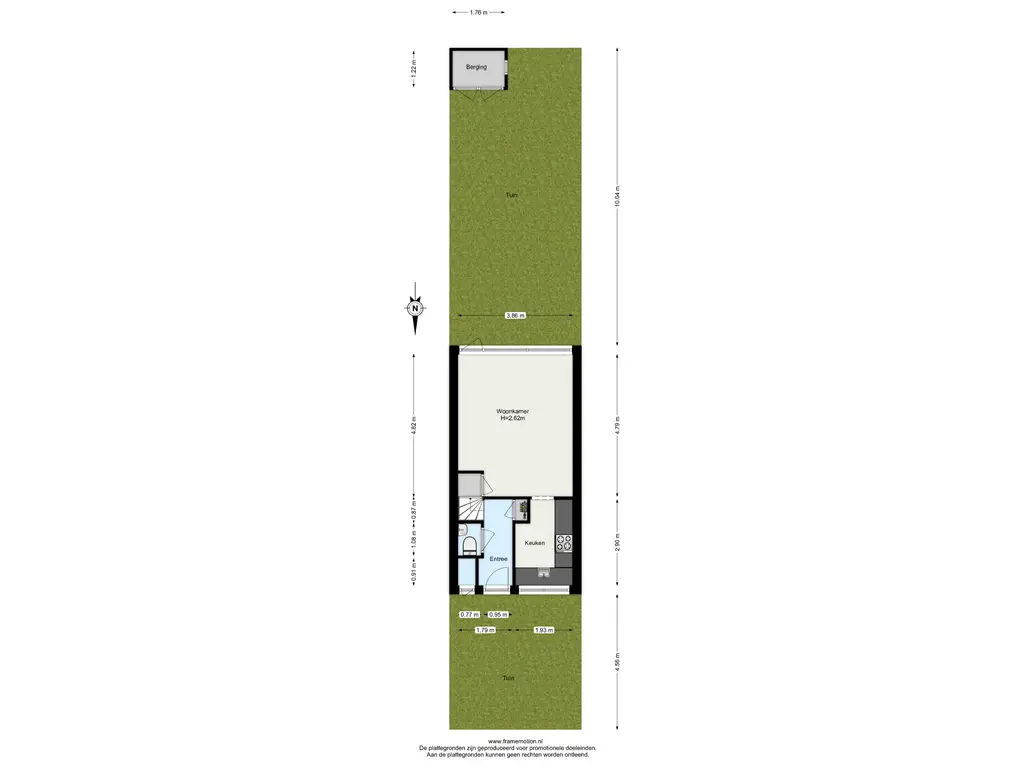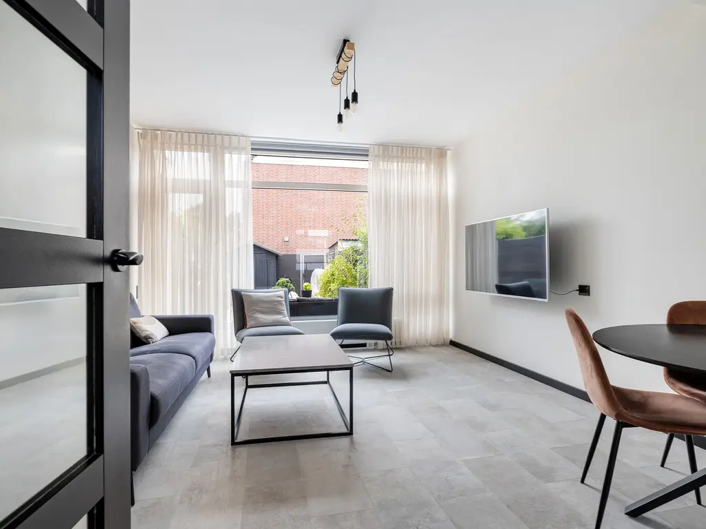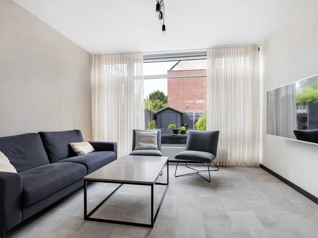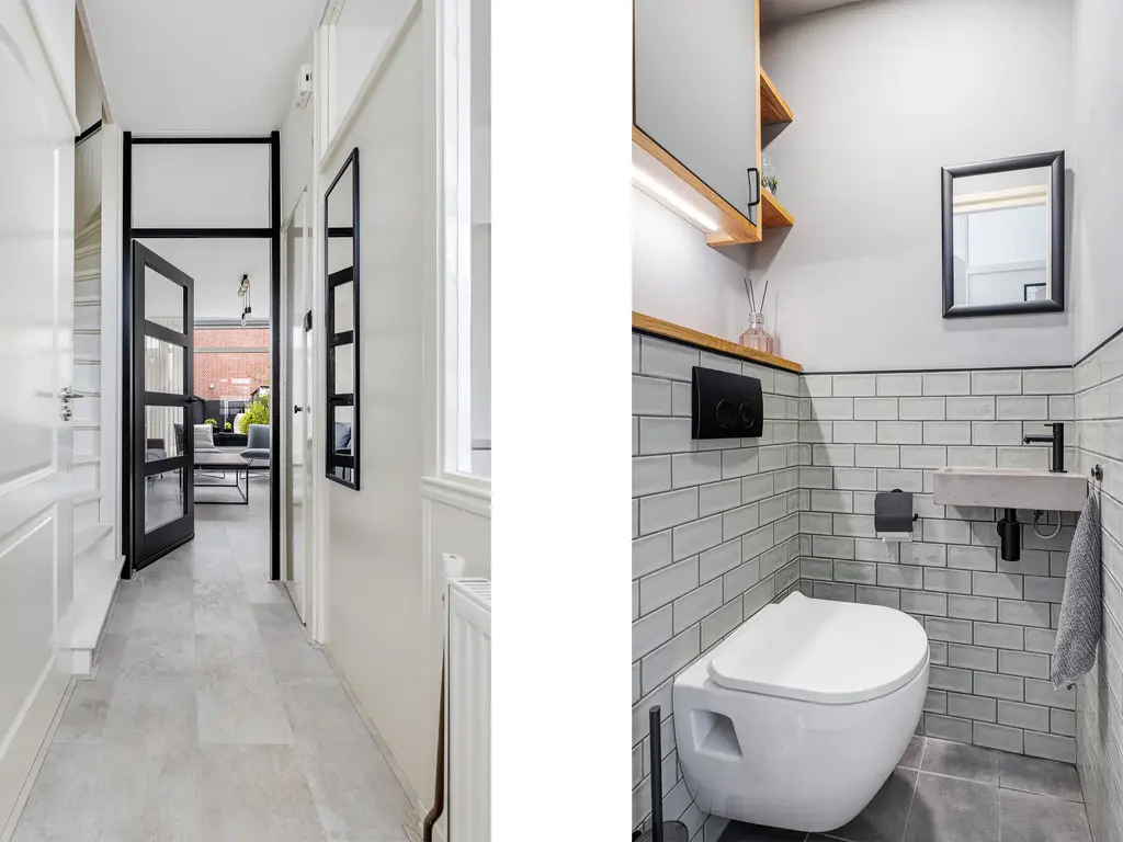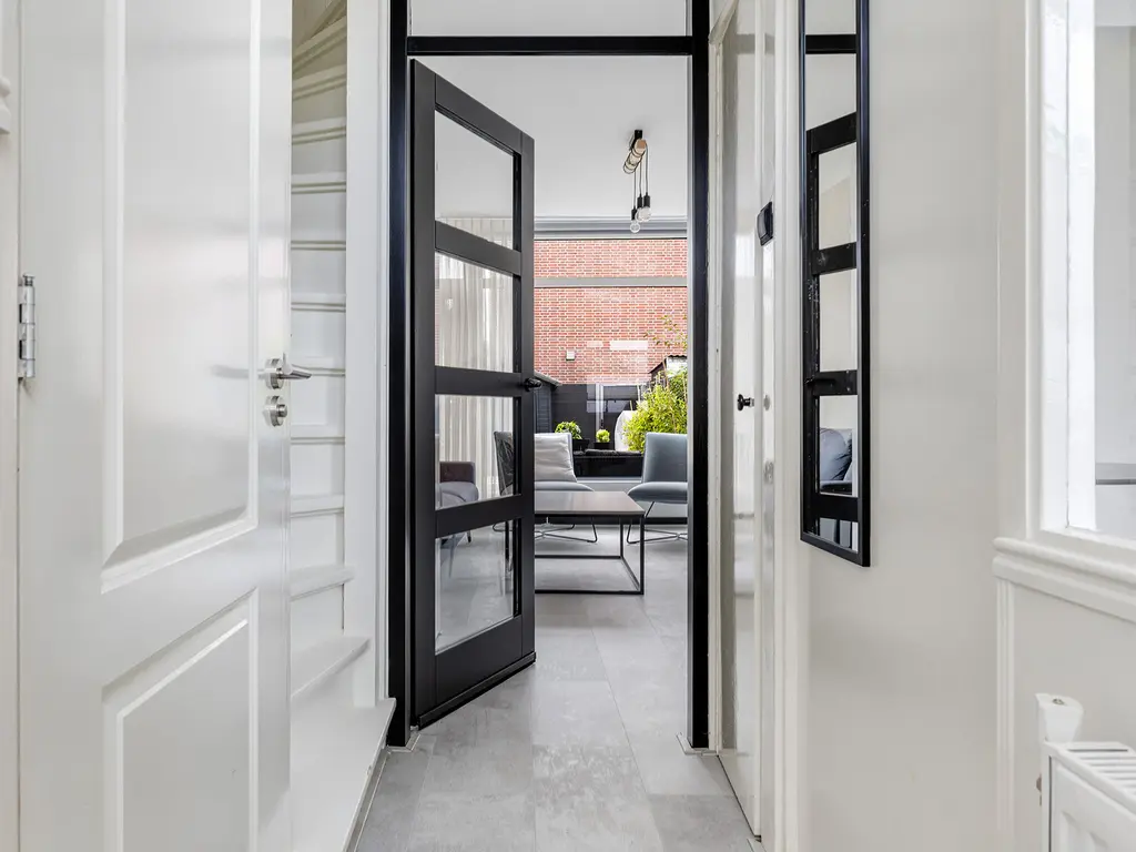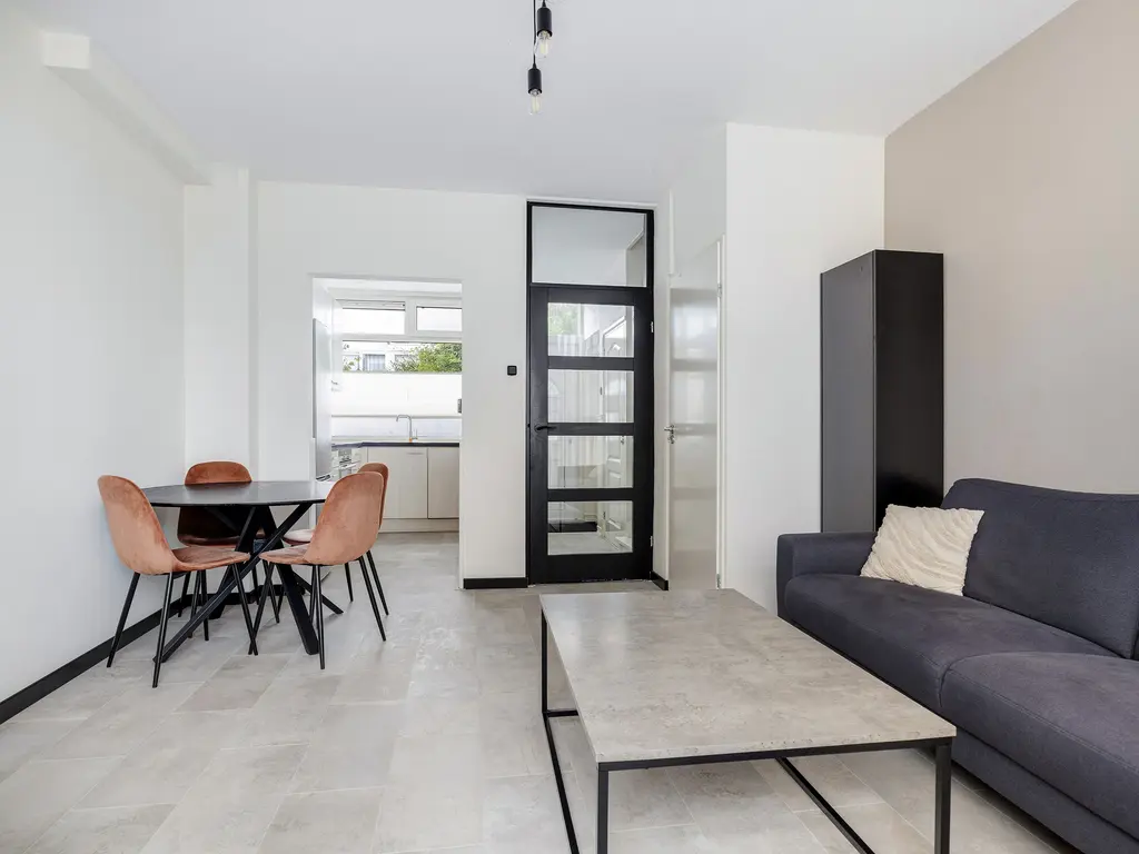Door de voortuin kom je bij de voordeur. Naast de voordeur is er een kleine berging. Eenmaal binnen, sta je in de hal. Deze biedt toegang tot de woonkamer, toilet en de trapopgang. In de hal is er ook een glazen doorkijk raam naar de keuken. De woonkamer is tuingericht. De achtertuin is maar liefs 10 meter lang.
