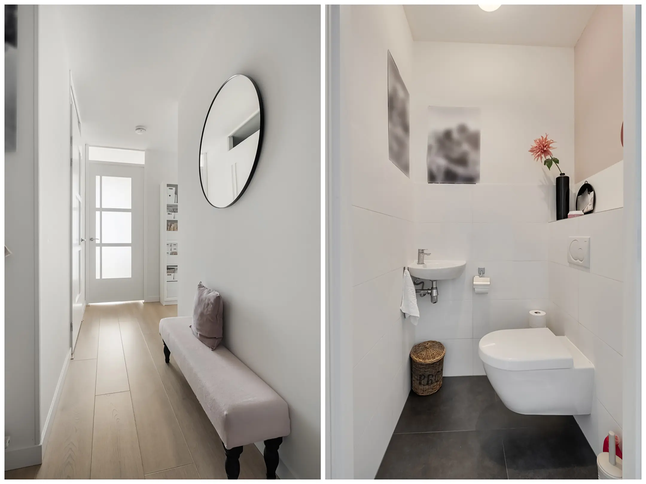 De moderne badkamer is strak afgewerkt met een grote inloopdouche met glazen douchewand, een stijlvol wastafelmeubel en een hoge badkamerkast. Daarnaast is er een separaat toilet, deels betegeld in wit/grijs.