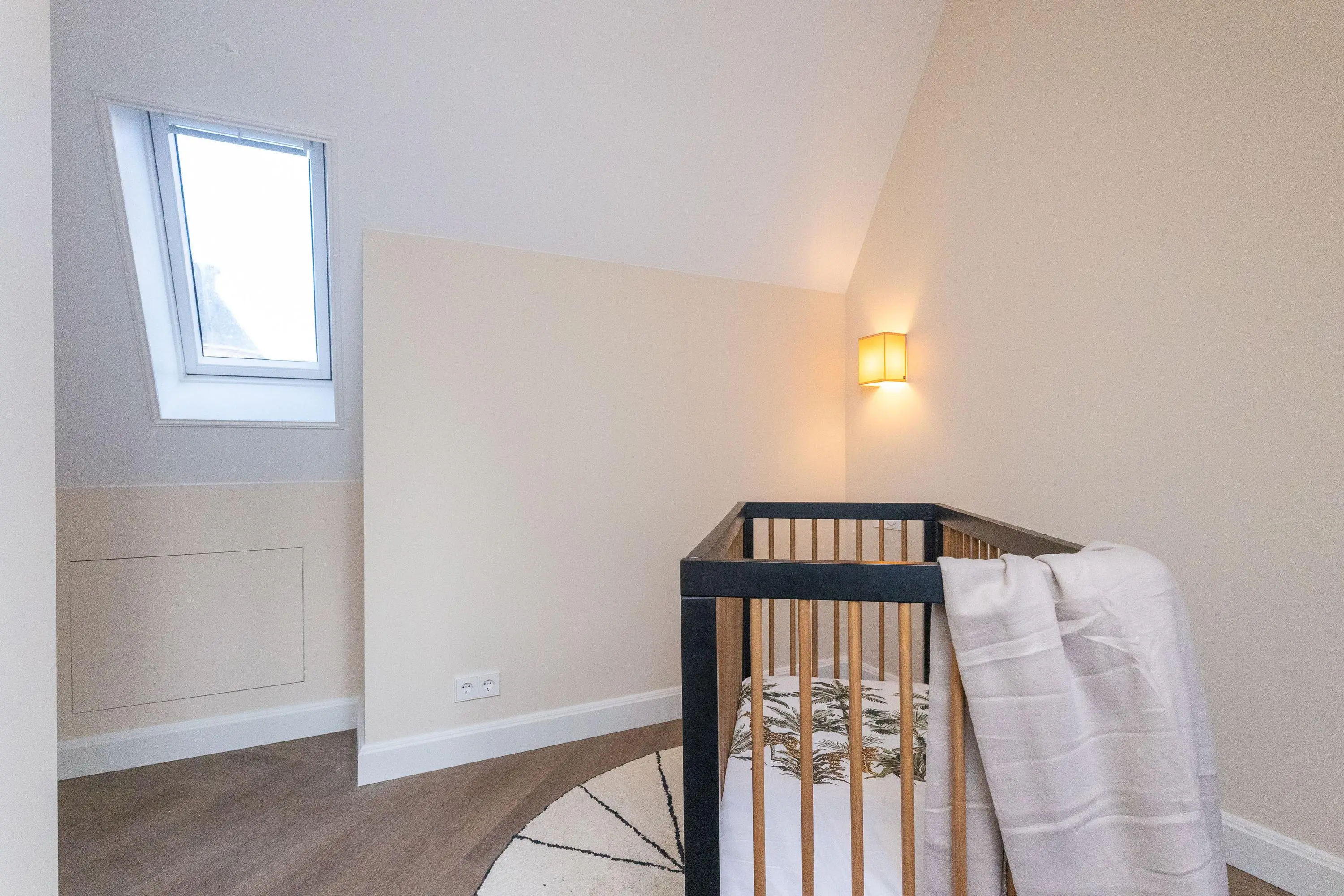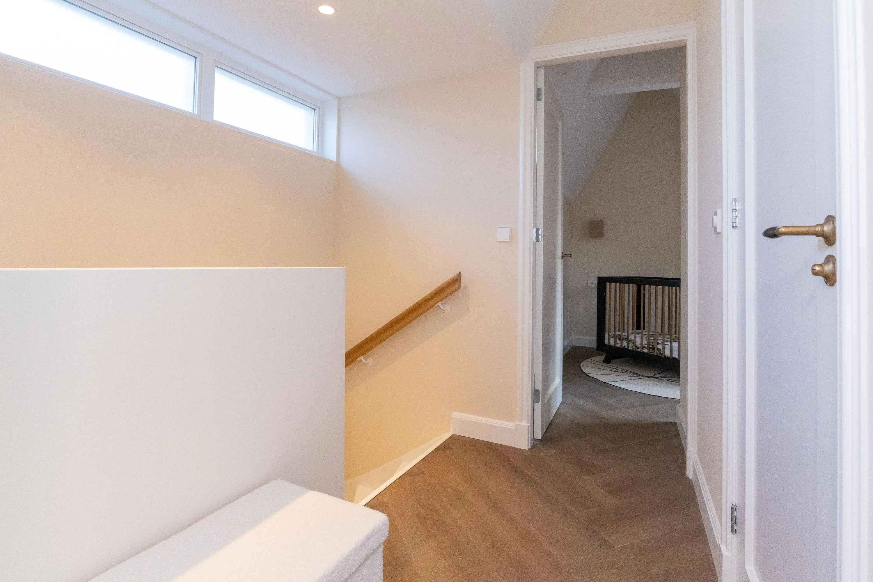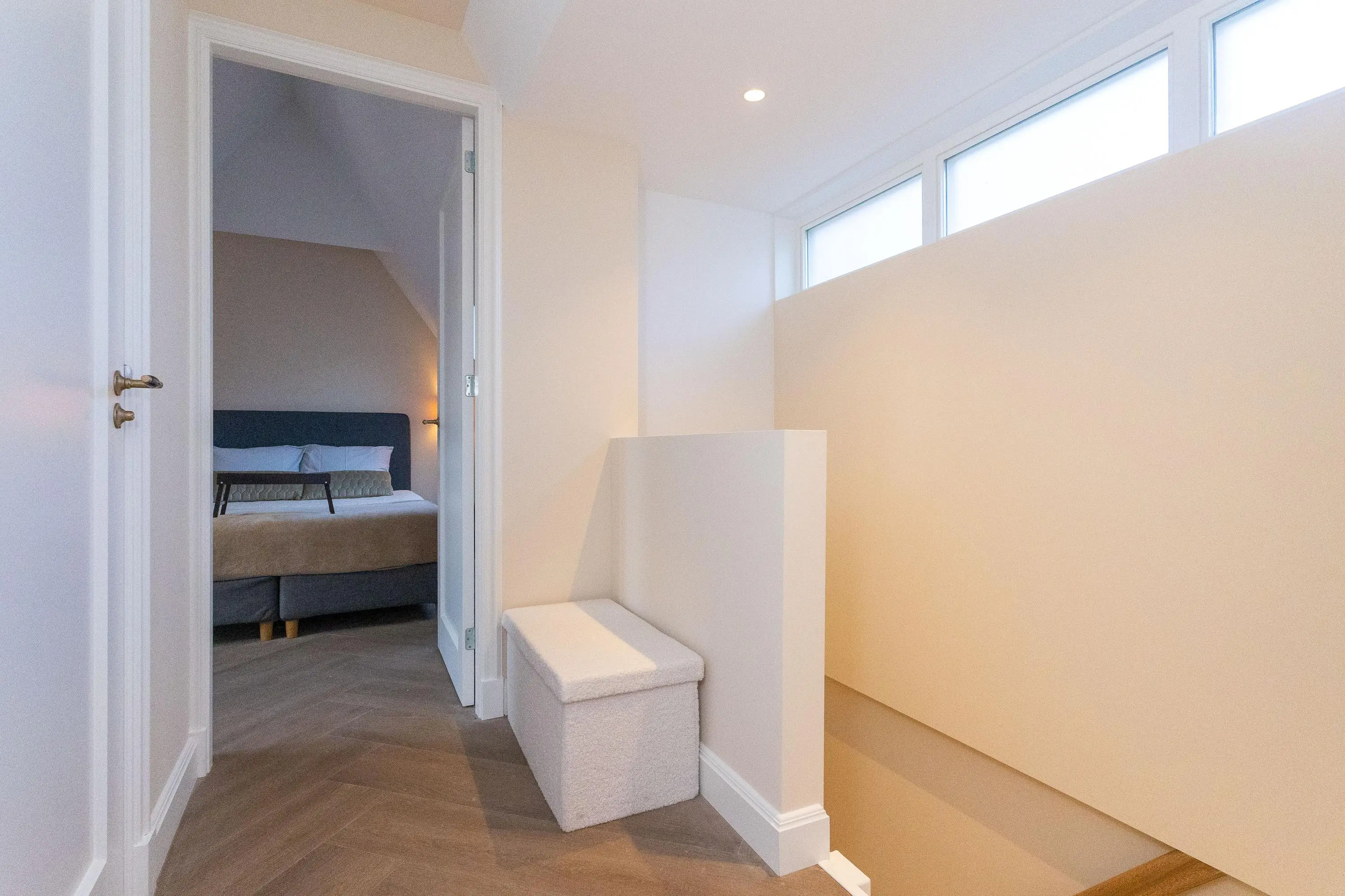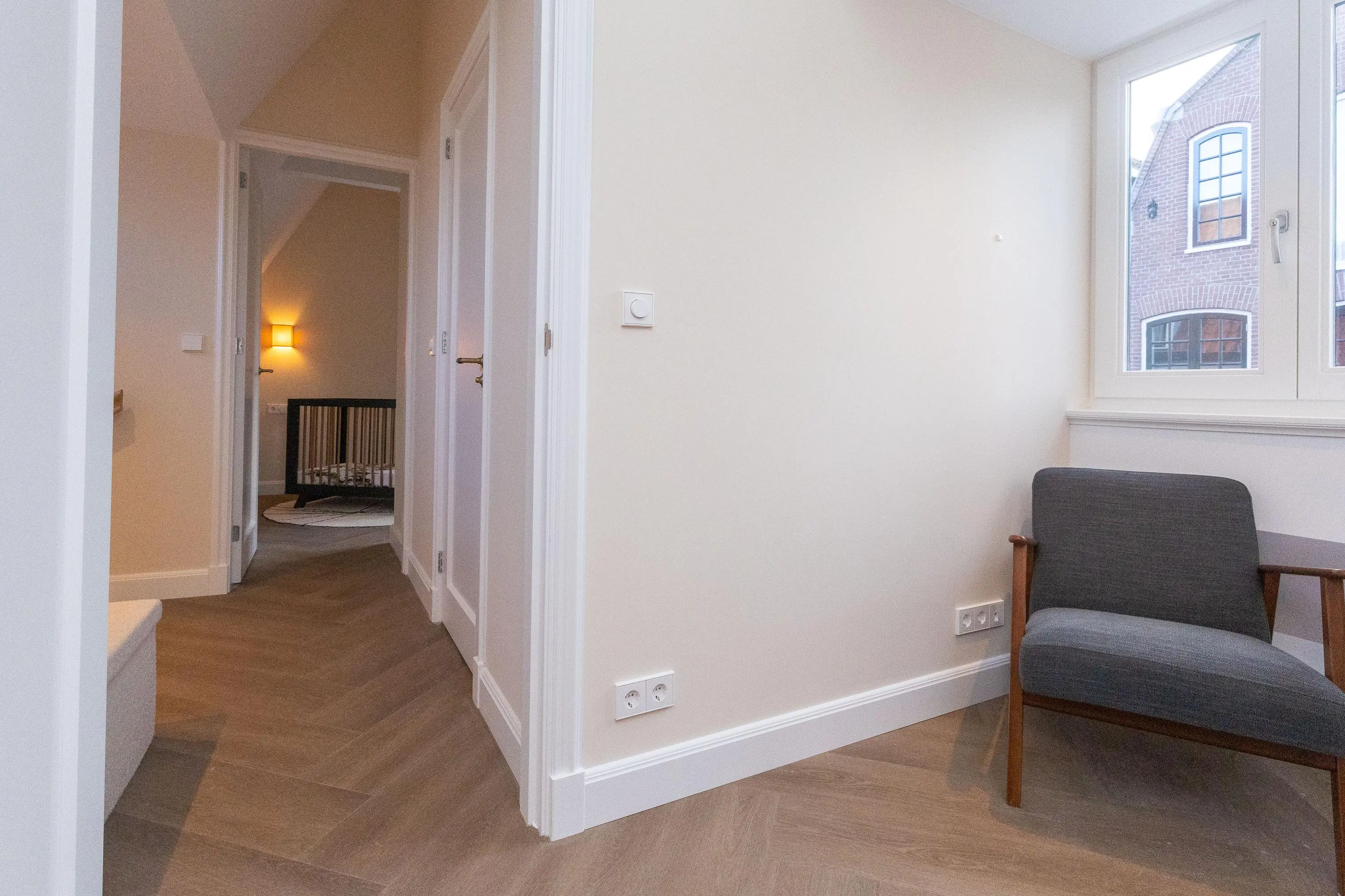 1e verdieping: overloop, 2-tal slaapkamers beide met een dakkapel en een luxe badkamer met inloopdouche en een wastafel. De 1e verdieping is eveneens voorzien van een visgraad pvc vloer en een vloerverwarming.