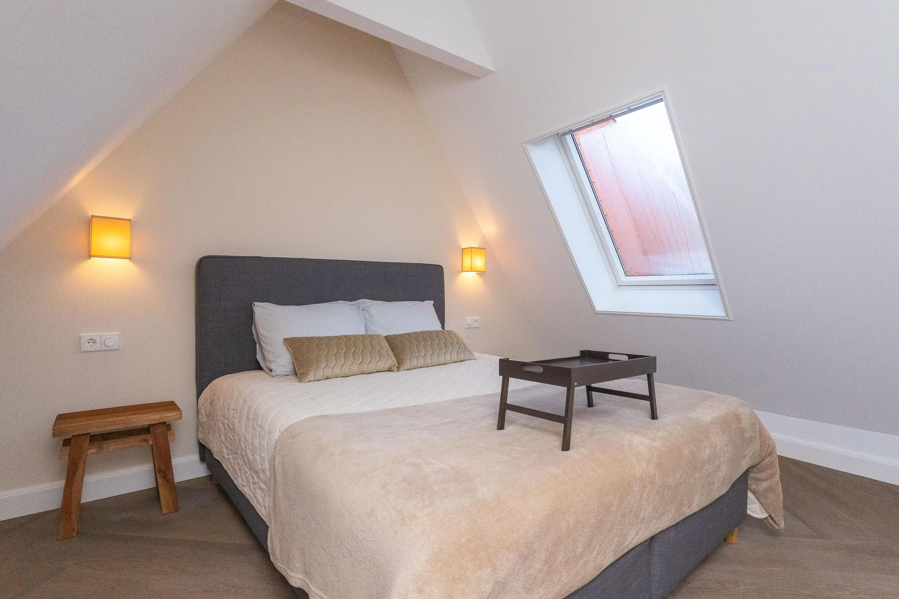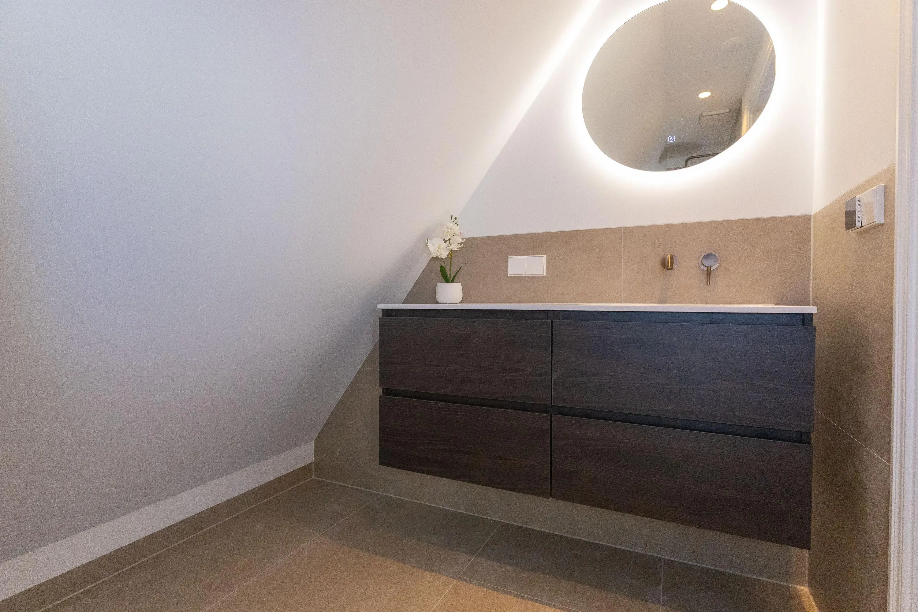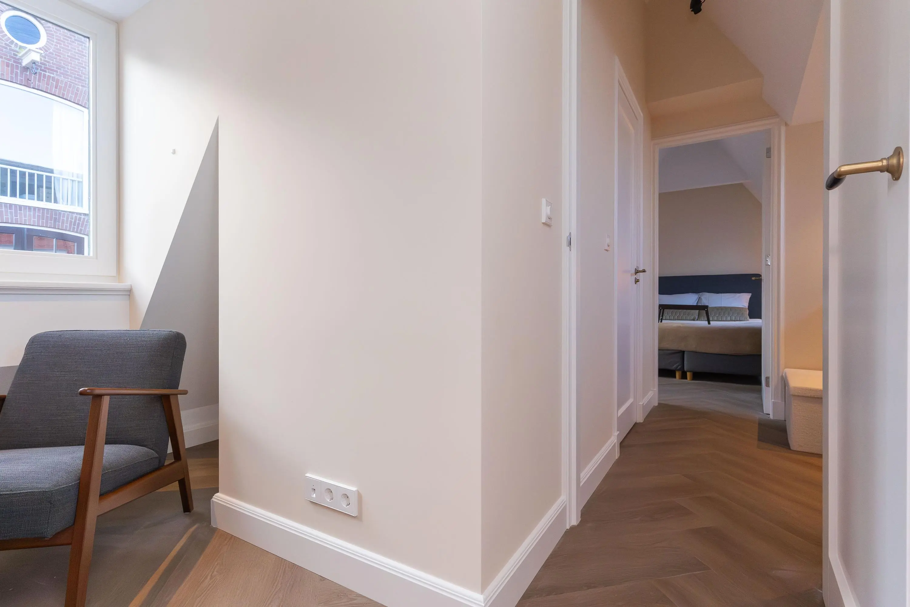 1e verdieping: overloop, 2-tal slaapkamers beide met een dakkapel en een luxe badkamer met inloopdouche en een wastafel. De 1e verdieping is eveneens voorzien van een visgraad pvc vloer en een vloerverwarming.