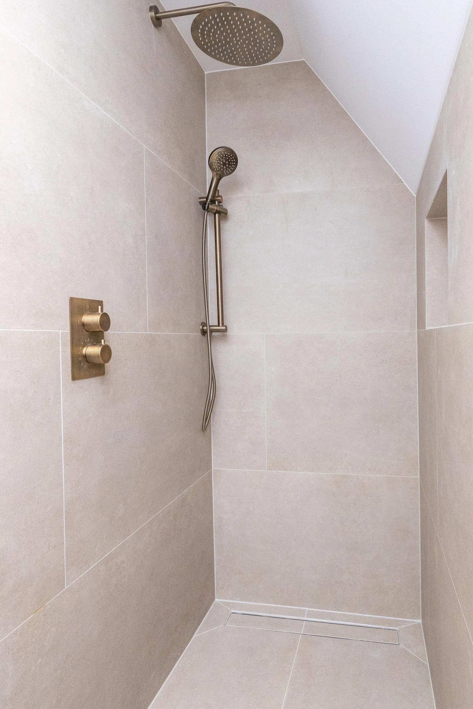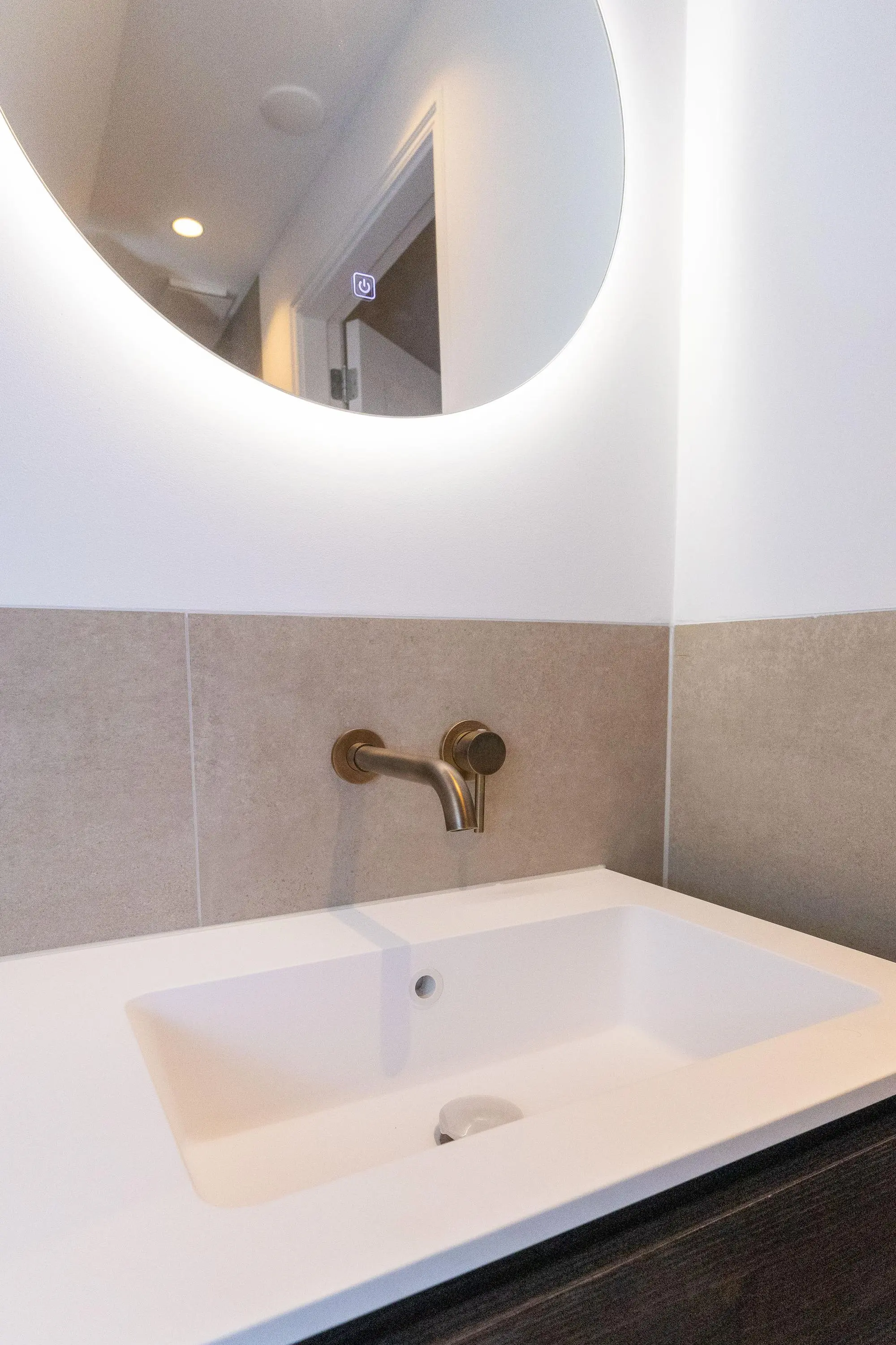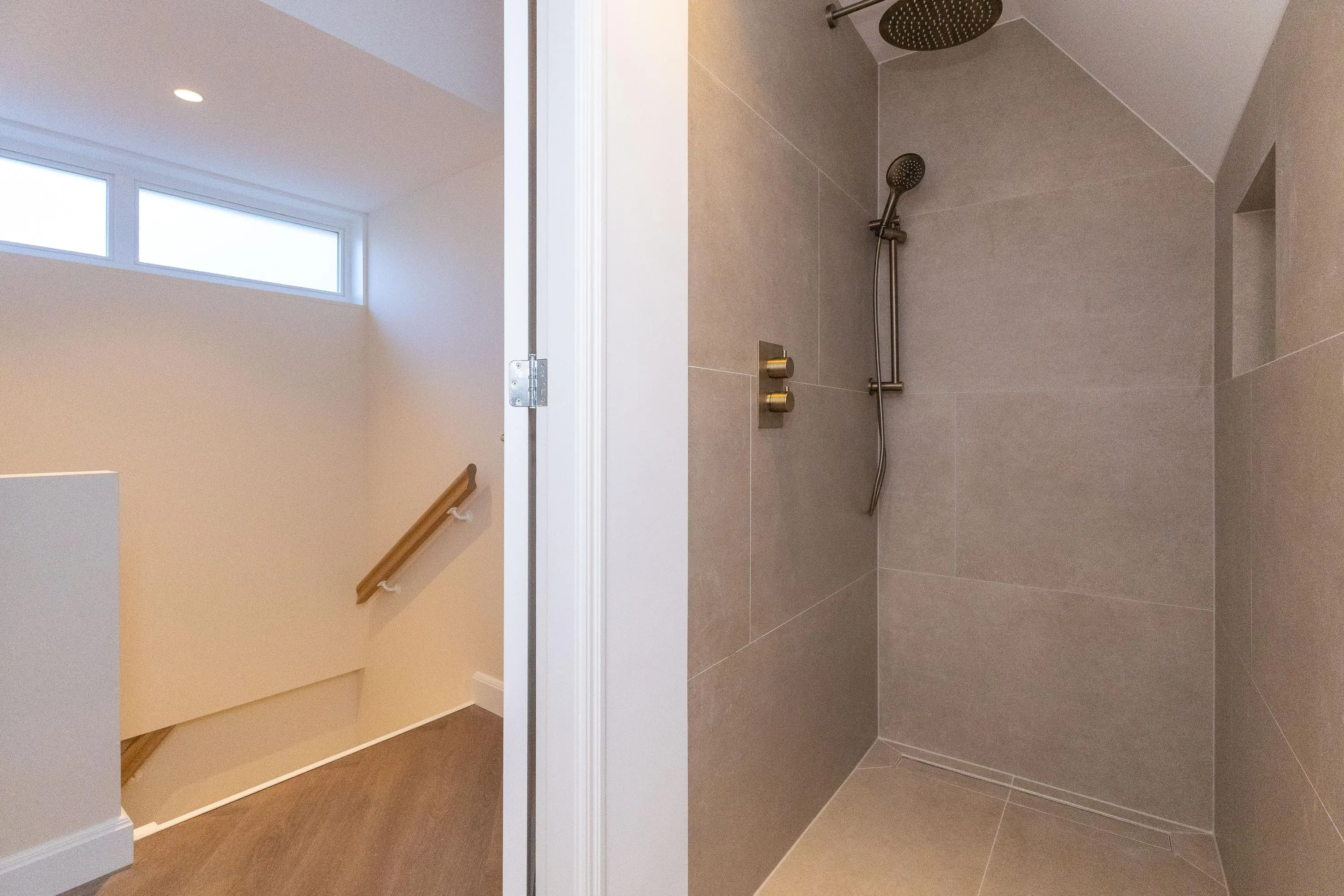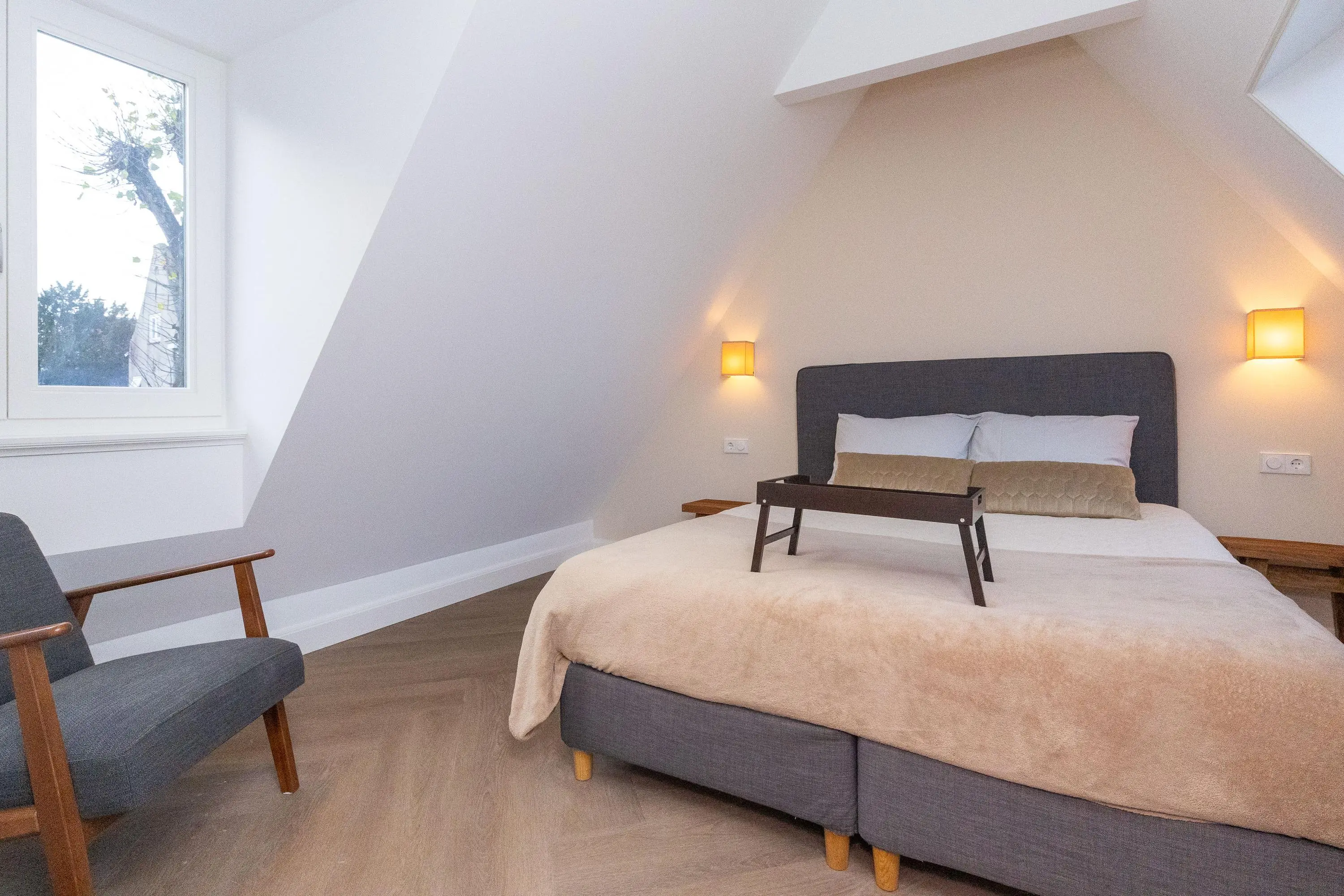 1e verdieping: overloop, 2-tal slaapkamers beide met een dakkapel en een luxe badkamer met inloopdouche en een wastafel. De 1e verdieping is eveneens voorzien van een visgraad pvc vloer en een vloerverwarming.
