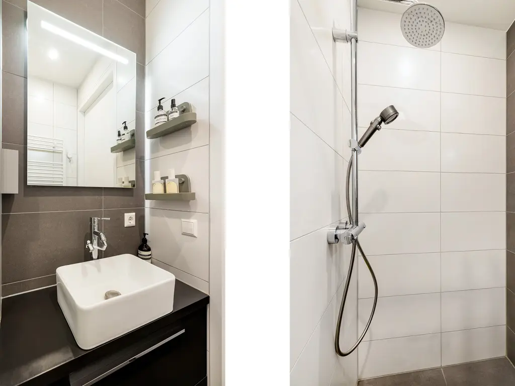 Gang met berging en entree appartement. Hal met toegang tot douche, toilet, meterkast en woonkamer met open keuken, voorzien van alle inbouwapparatuur en open slaapgedeelte. Werk/studeer- of slaapkamer, badkamer met badkamermeubel en douche, apart toilet.