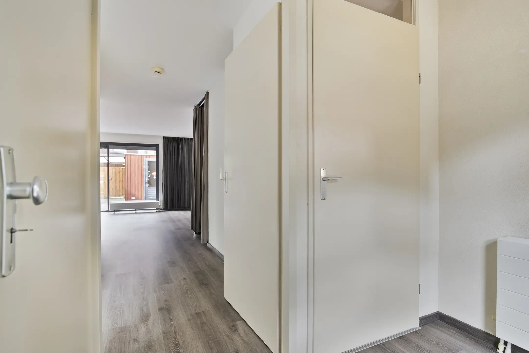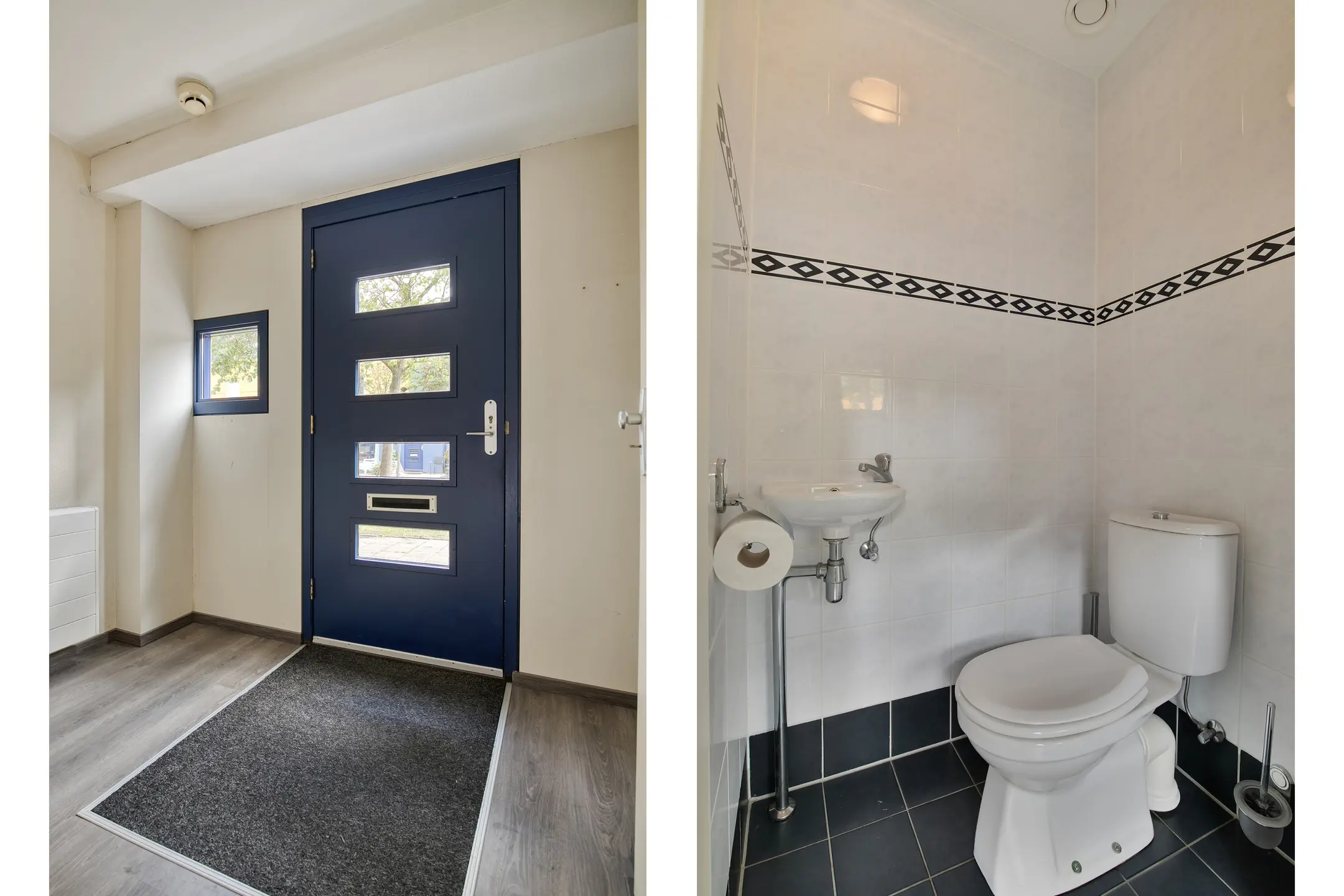 Entree, hal met meterkast, toiletruimte voorzien van een duoblok en fonteintje. De toiletruimte is geheel betegeld in een lichte kleurstelling. Toegang tot het woongedeelte.
