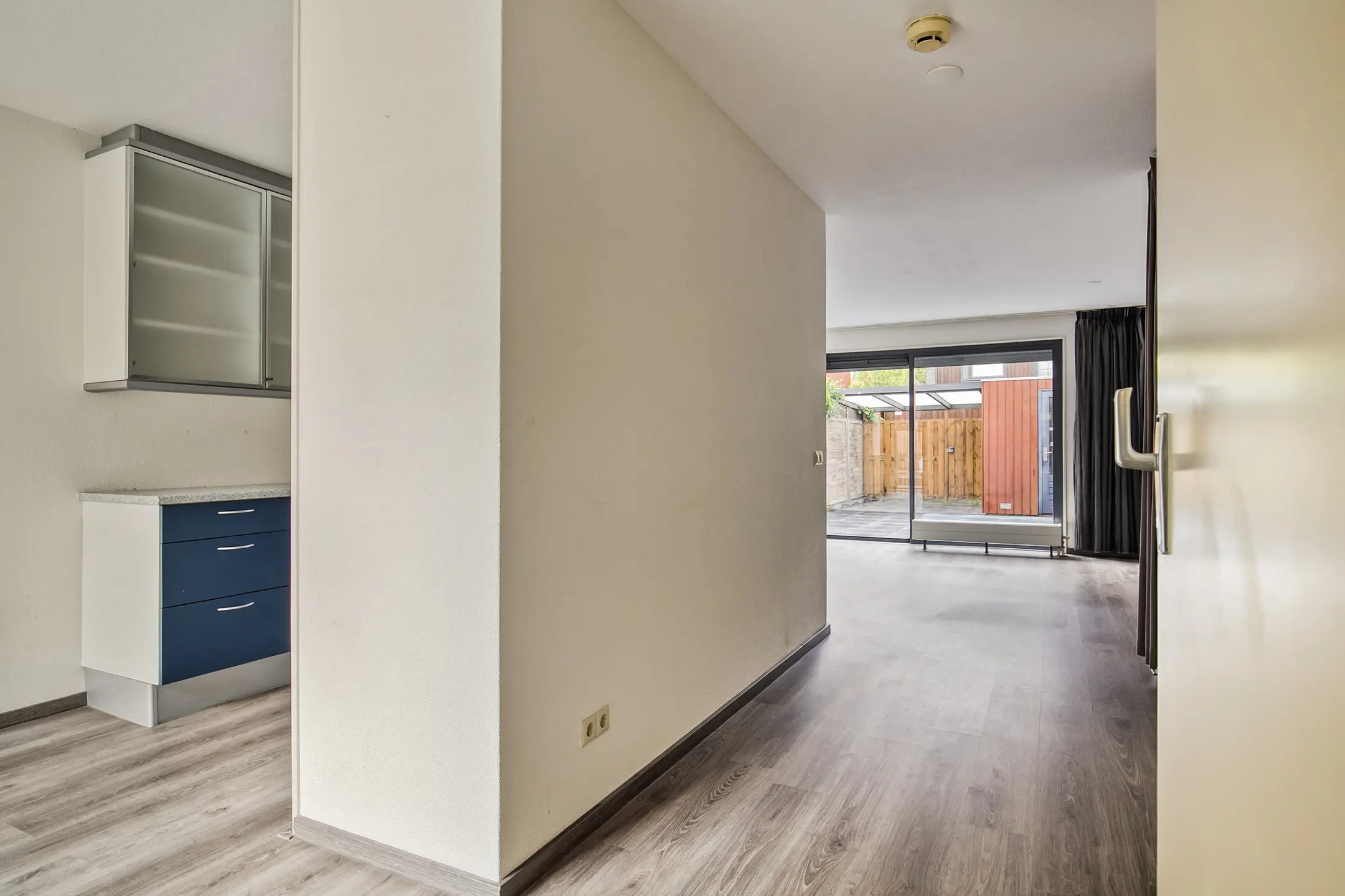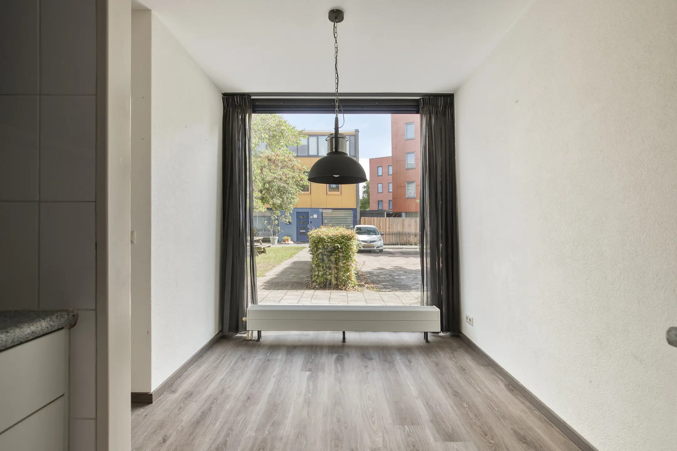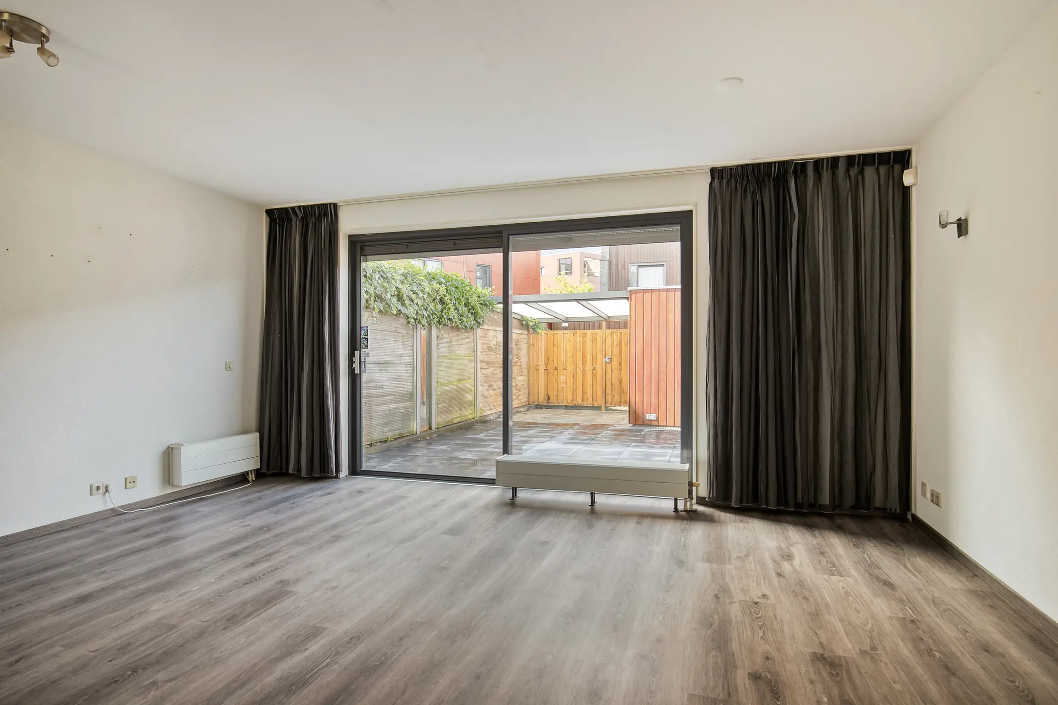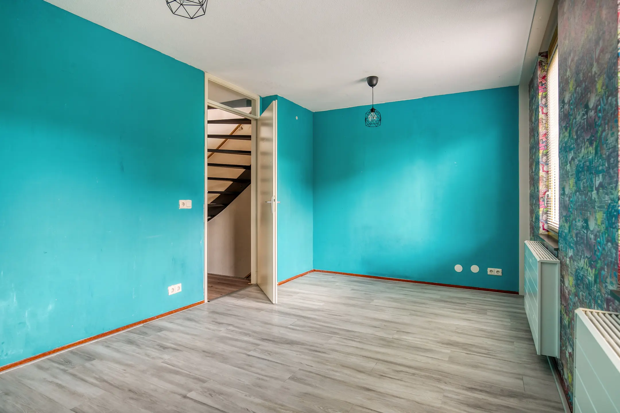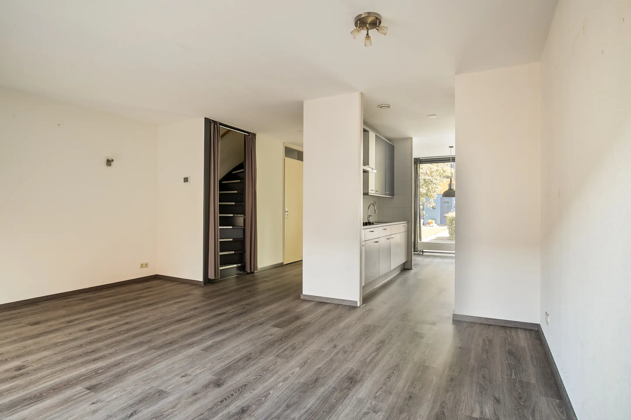 Tuingerichte woonkamer (ca. 22 m2) voorzien van een lichte laminaatvloer, een handige trapkast en elektrisch bedienbaar rolluik. Trap naar de verdieping. Middels schuifpui heeft u toegang tot de zonnige achtertuin.