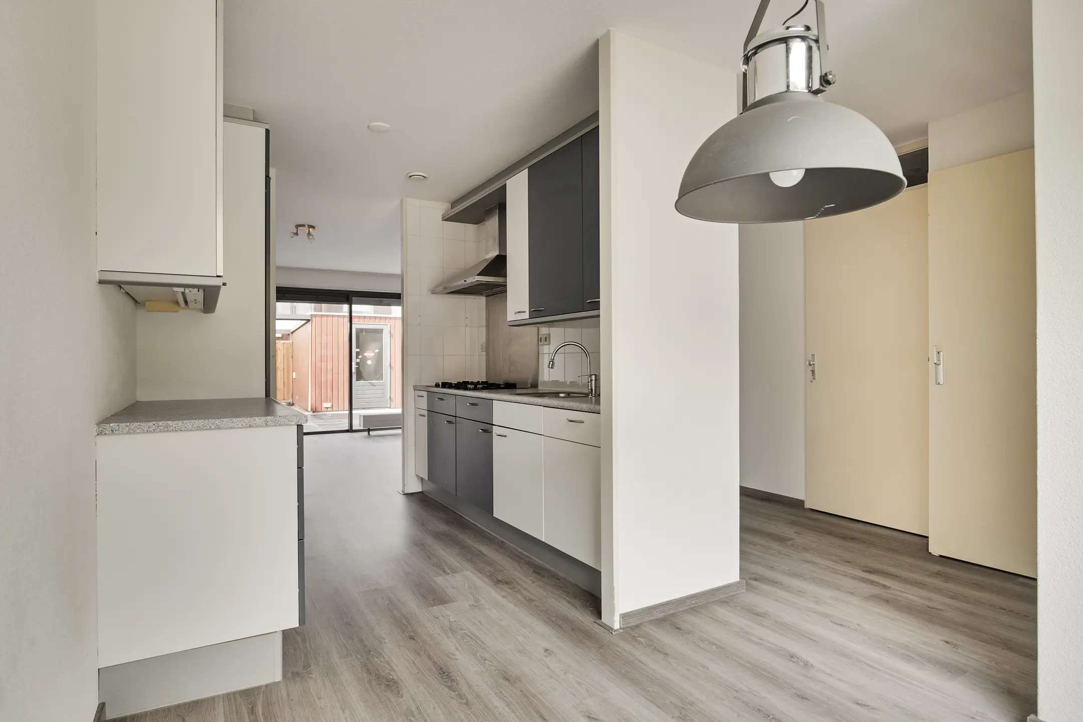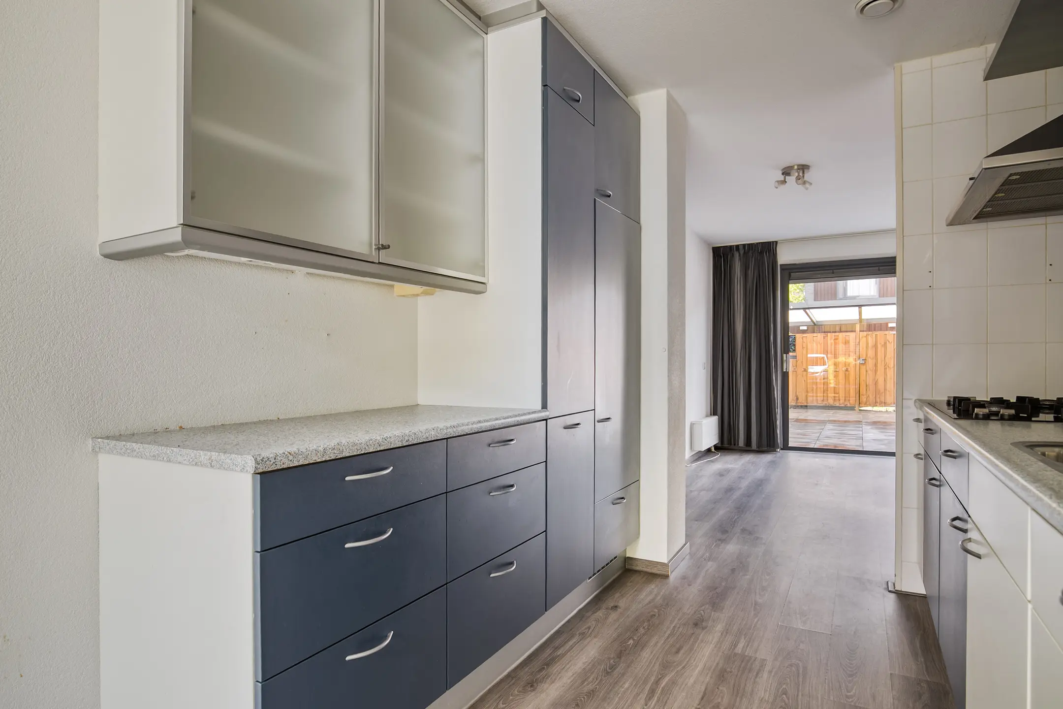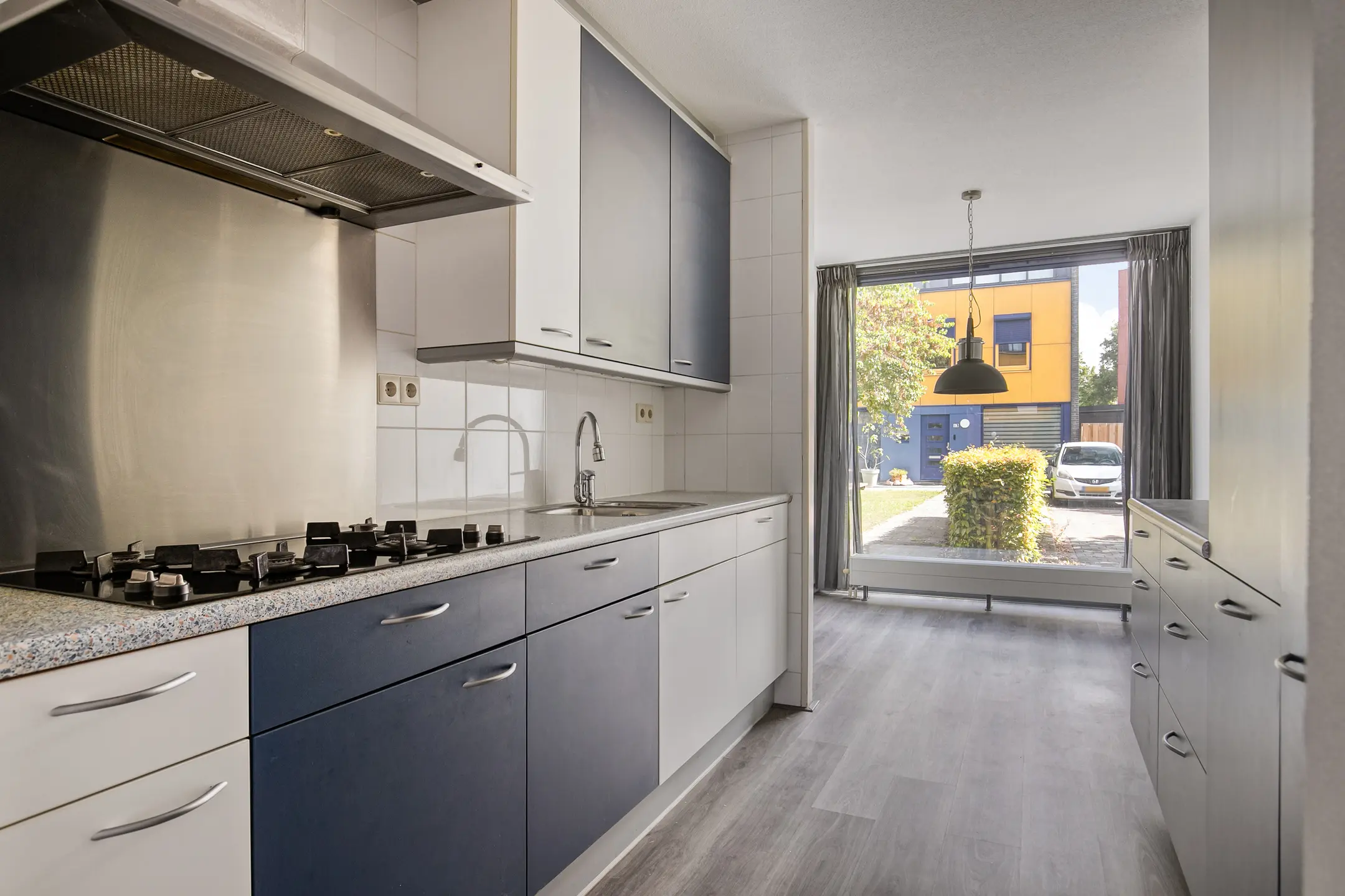 De moderne open keuken (ca. 20 m2) is uitgevoerd in twee rechte opstellingen en is voorzien van 1,5 spoelbak, koelkast met vriesvakje, 4-pits gaskookplaat, RVS afzuigkap en een vaatwasser. Het geheel is uitgevoerd in wit/blauwe kleuren en afgewerkt met een kunststof aanrechtblad, sfeerverlichting en laminaatvloer. Het aangrenzende eetgedeelte bevindt zich aan de voorzijde van de woning en vormt een fijne plek voor samen koken en tafelen. Dankzij de grote raampartij aan de voorzijde van de woning bieden de keuken en het eetgedeelte een fijne natuurlijke lichtinval.