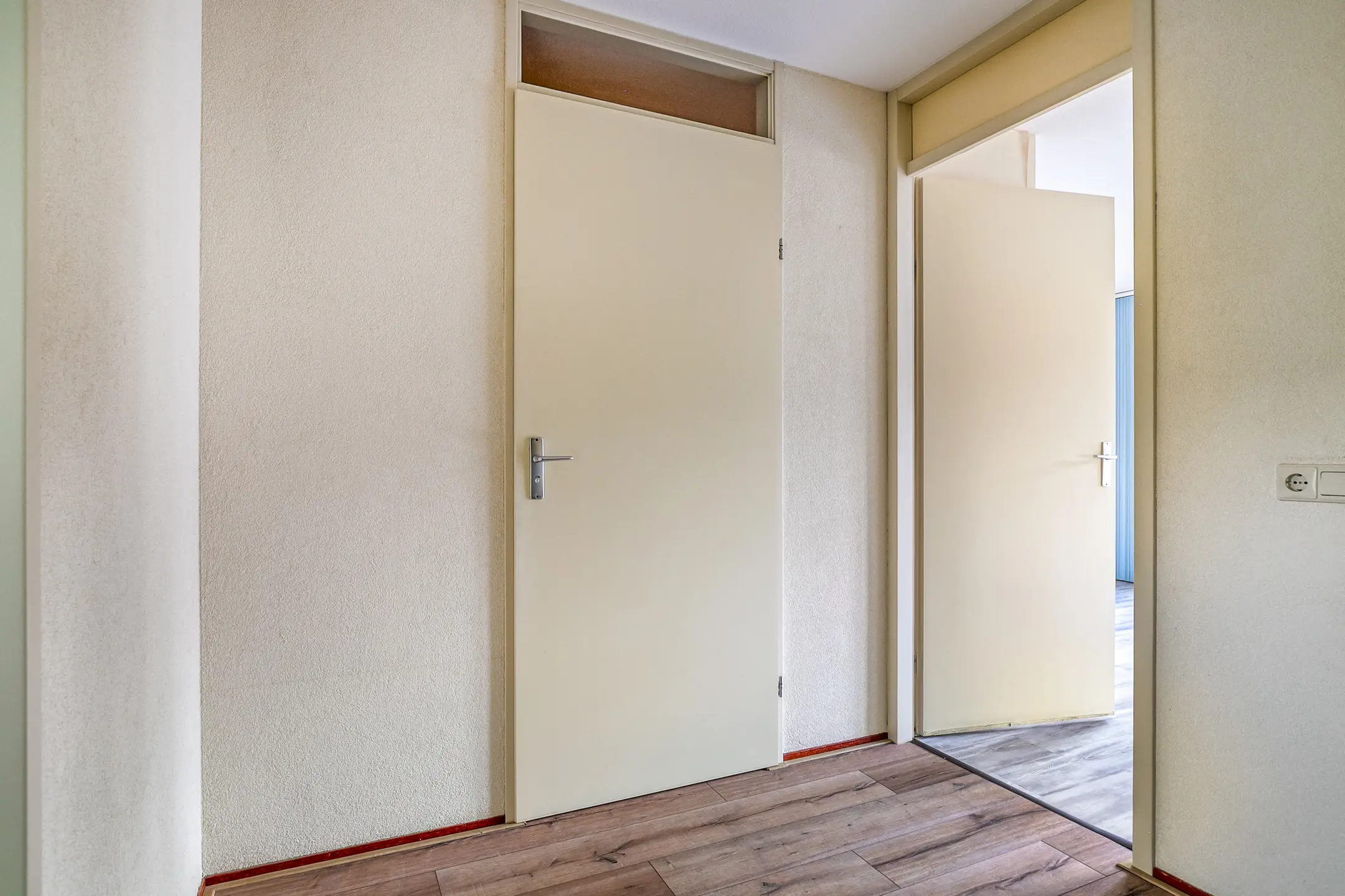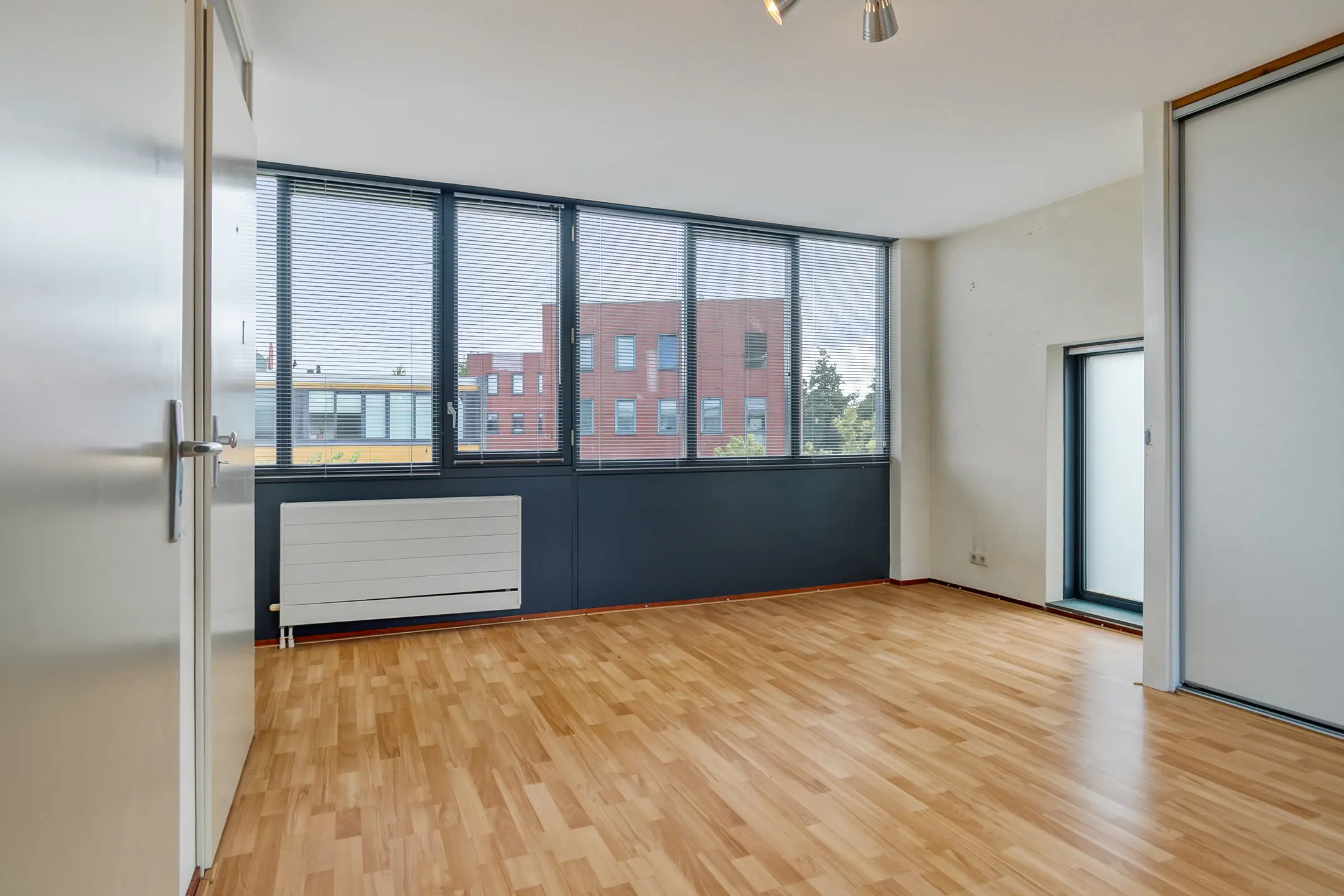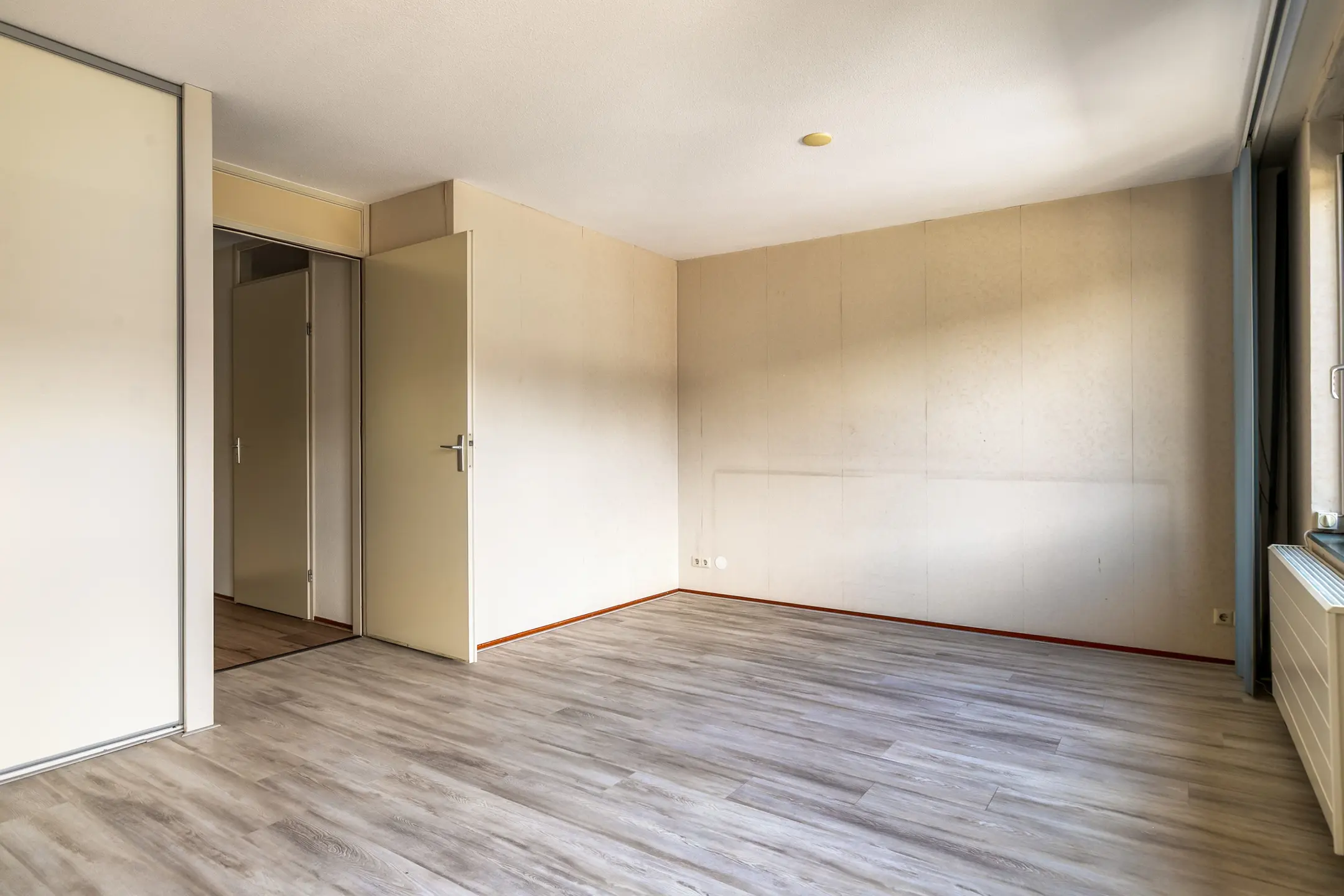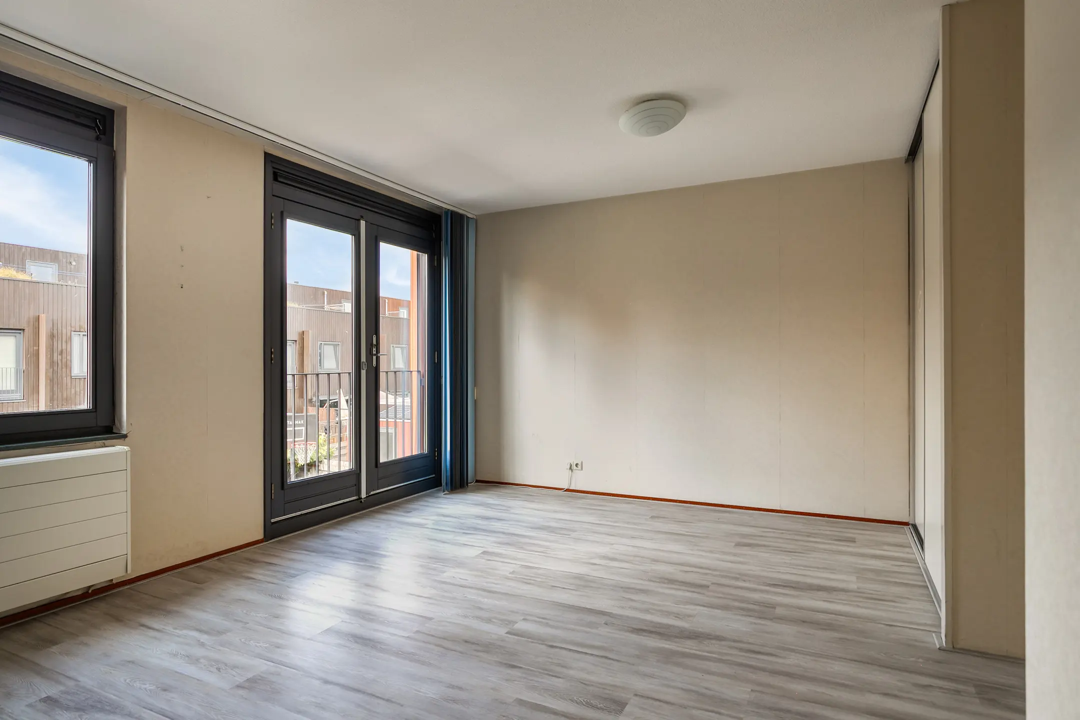 Slaapkamer 1 (ca. 20 m2) is gelegen aan de achterzijde van de woning en is voorzien van elektrisch bedienbaar rolluik en een 2-deuren schuifkastenwand. Verder heeft deze slaapkamer een gezellig Frans balkon met openslaande deuren wat zorgt voor veel natuurlijk licht en goede ventilatie.