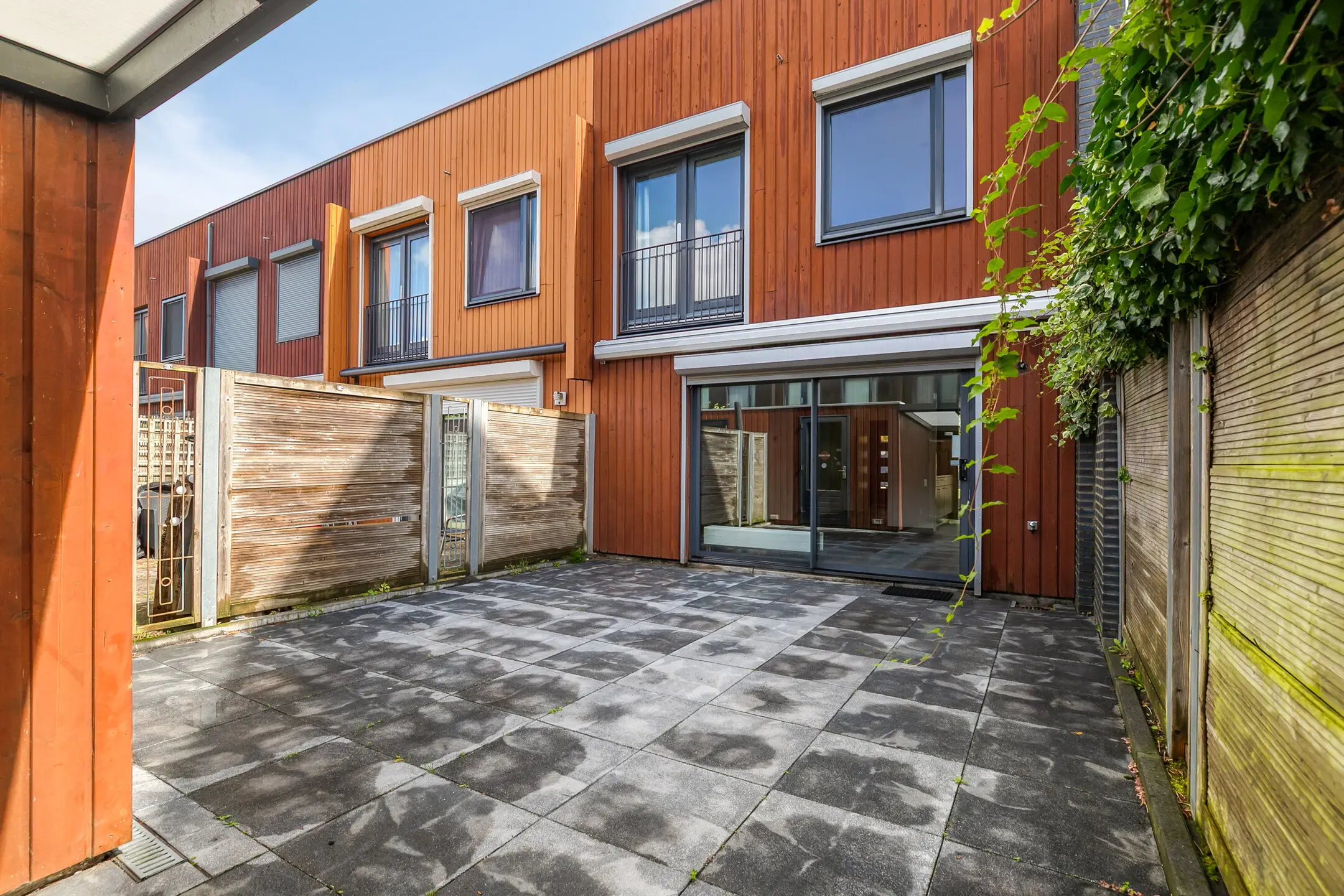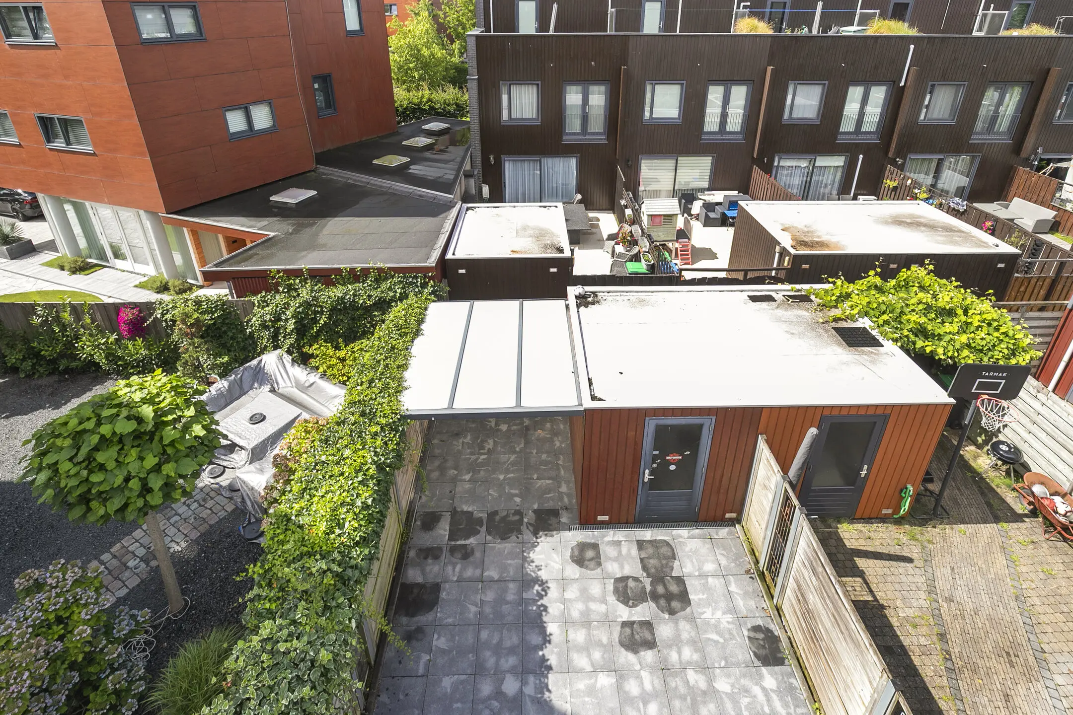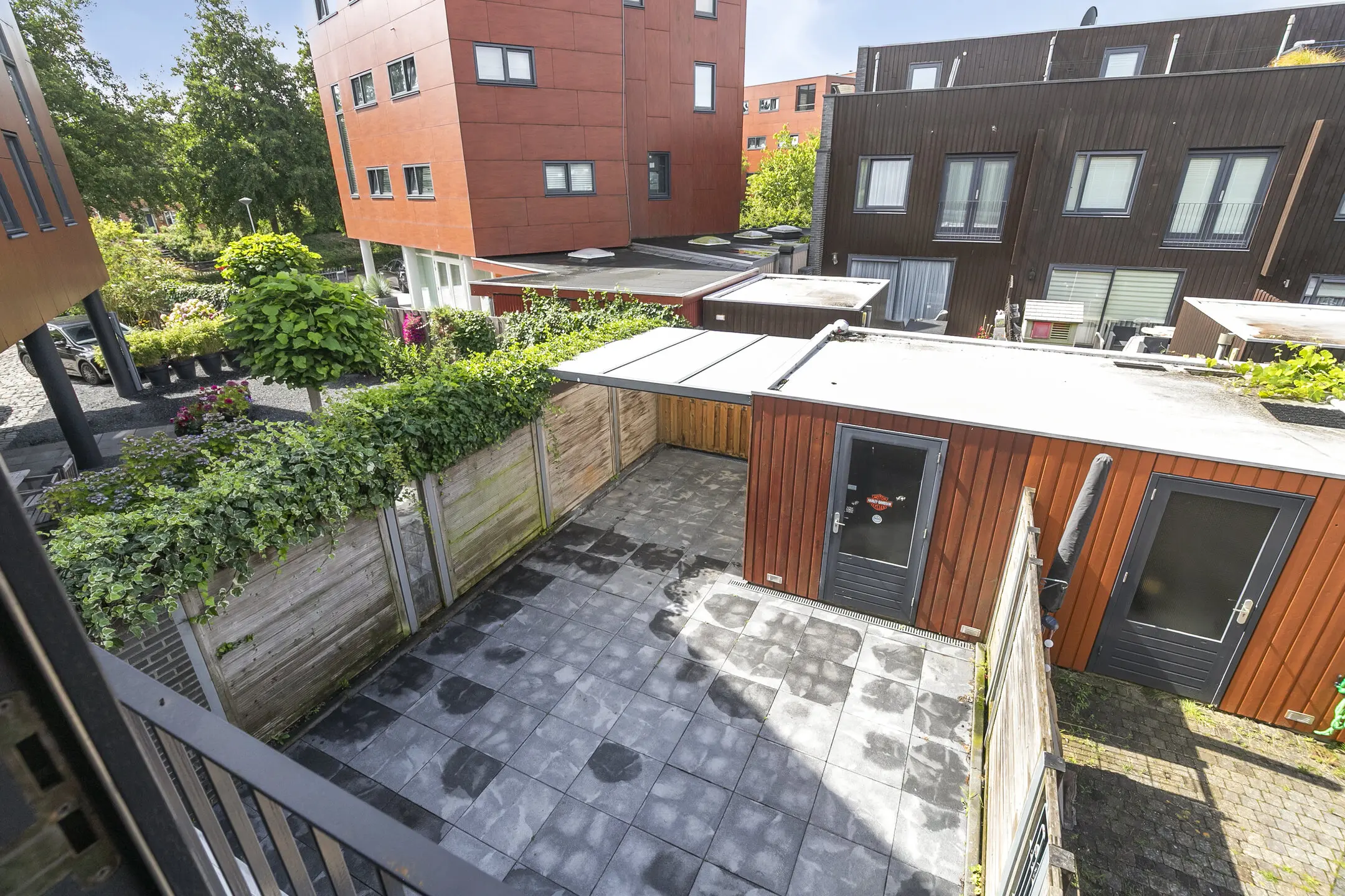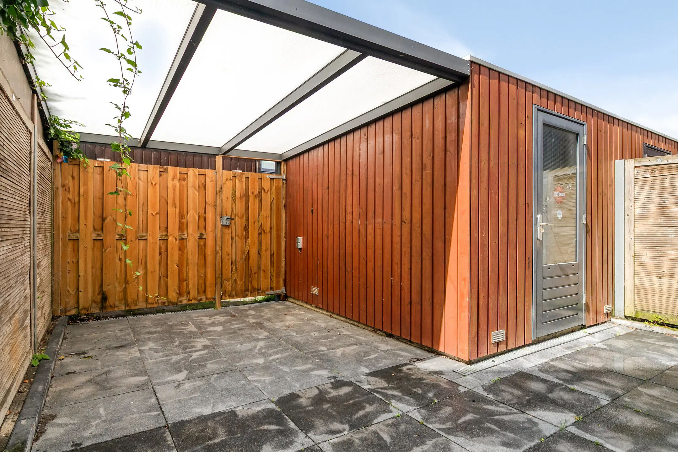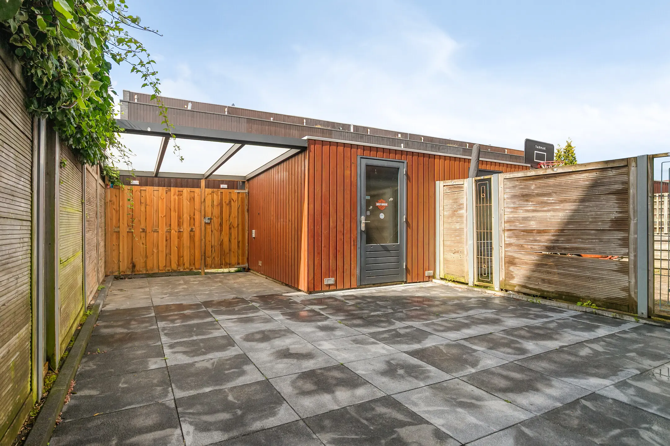 De achtertuin is gelegen op het zonnige zuidwesten en is onderhoudsvriendelijk aangelegd. De achtertuin beschikt over achterom, bestrating, buitenkraan, stopcontacten, elektrisch bedienbaar zonnescherm over de gehele breedte, een handige overkapping voor de fietsen en een ruime berging.