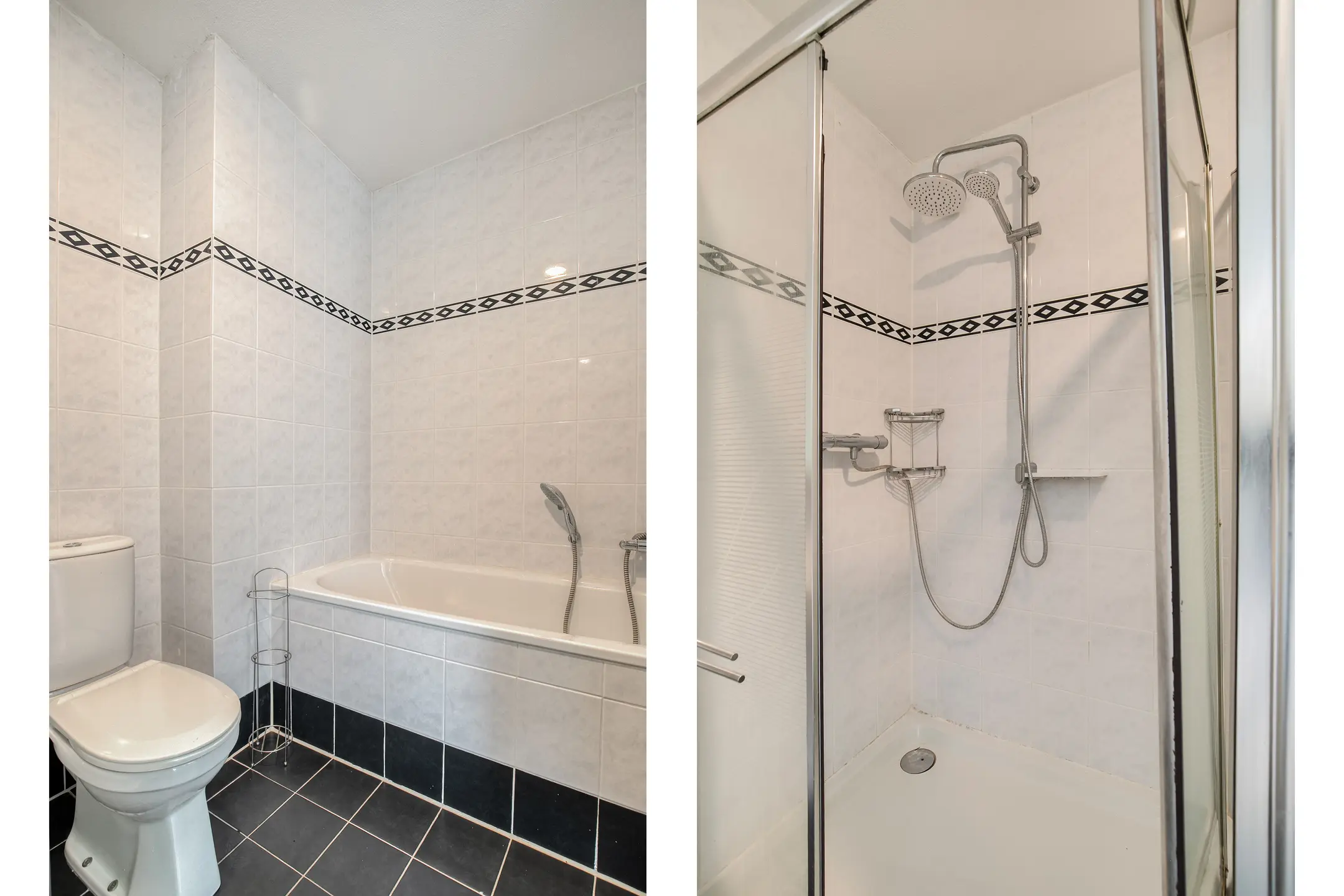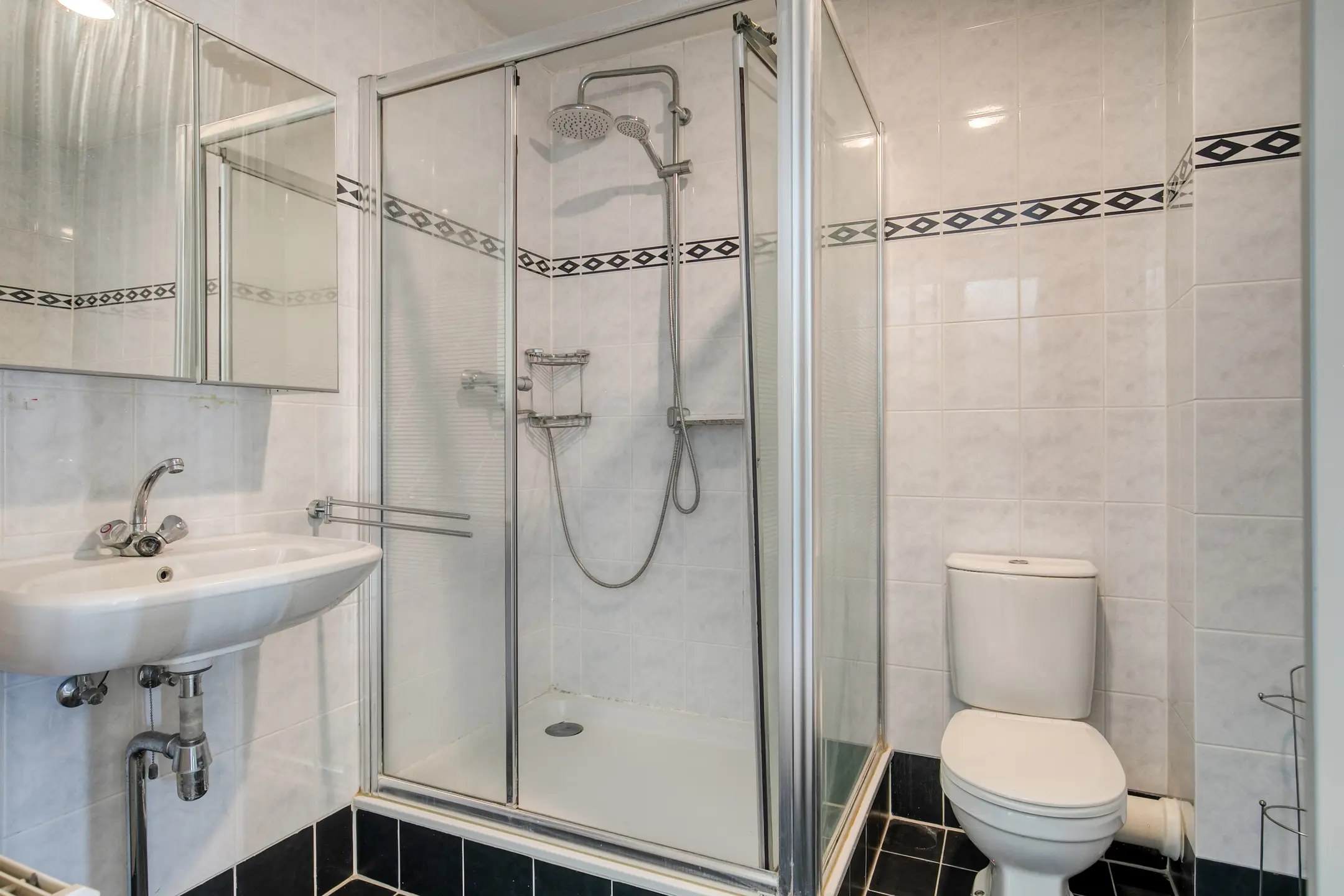 Nette badkamer (ca. 6 m2) met sanitaire voorzieningen zoals een wastafel, spiegel met spiegelkast en verlichting, tweede toilet, ligbad en een douchecabine met regendouche. De badkamer is geheel betegeld met lichte grijze wandtegels en zwarte vloertegels.