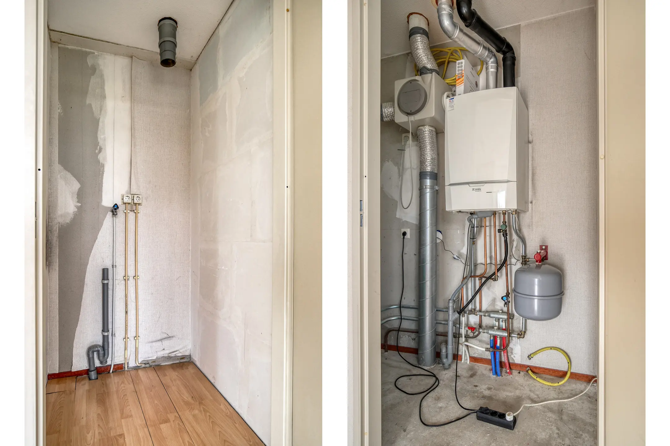 Open zolder (ca. 27 m2) met een bergkast met stelplaats voor de HR C.V. combiketel (Remeha Calenta 2011), een bergkast met de wasmachine- en drogeraansluiting en een 3-deuren schuifkastenwand. De zolder is afgewerkt met laminaatvloer.
