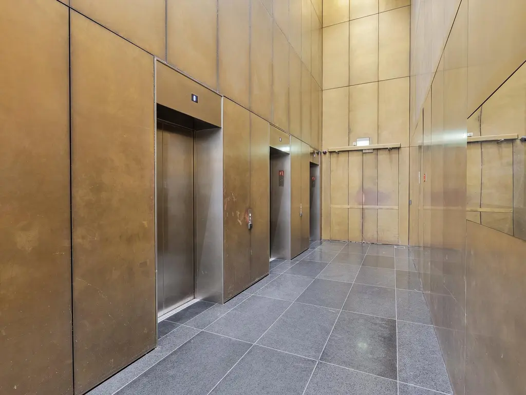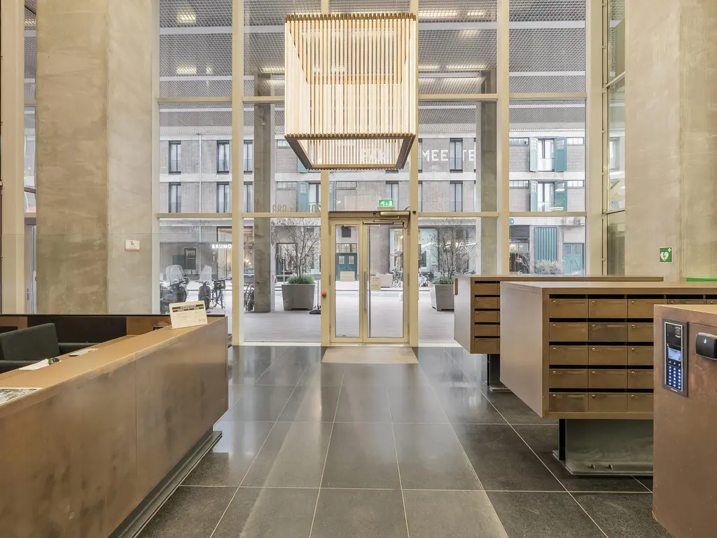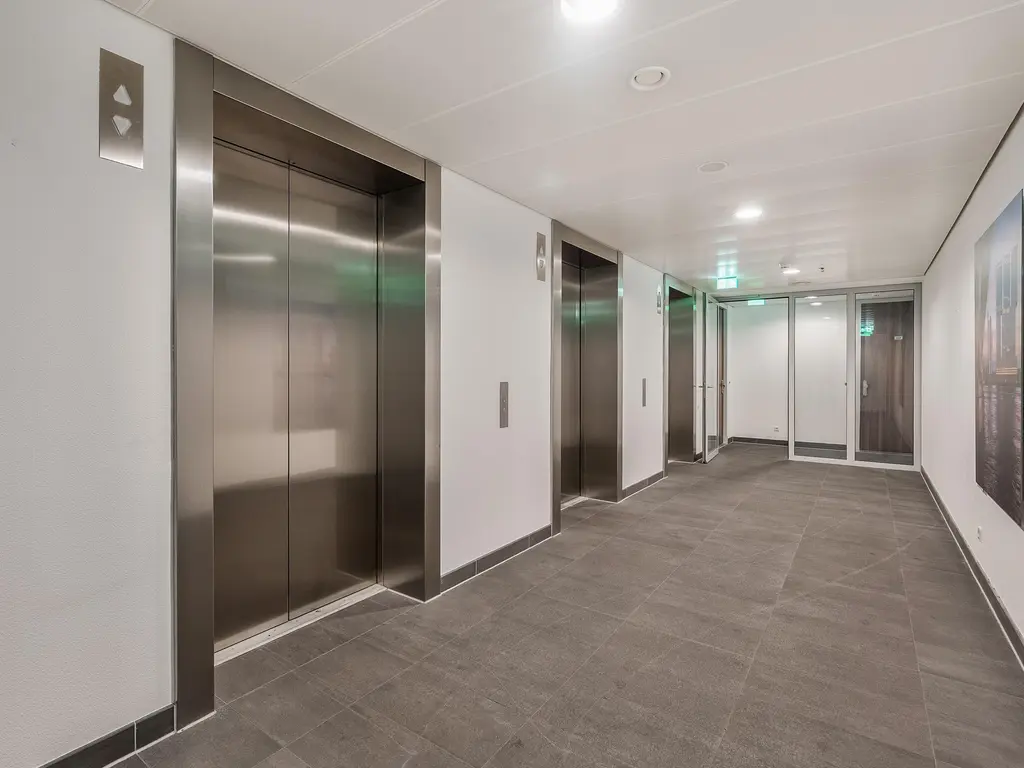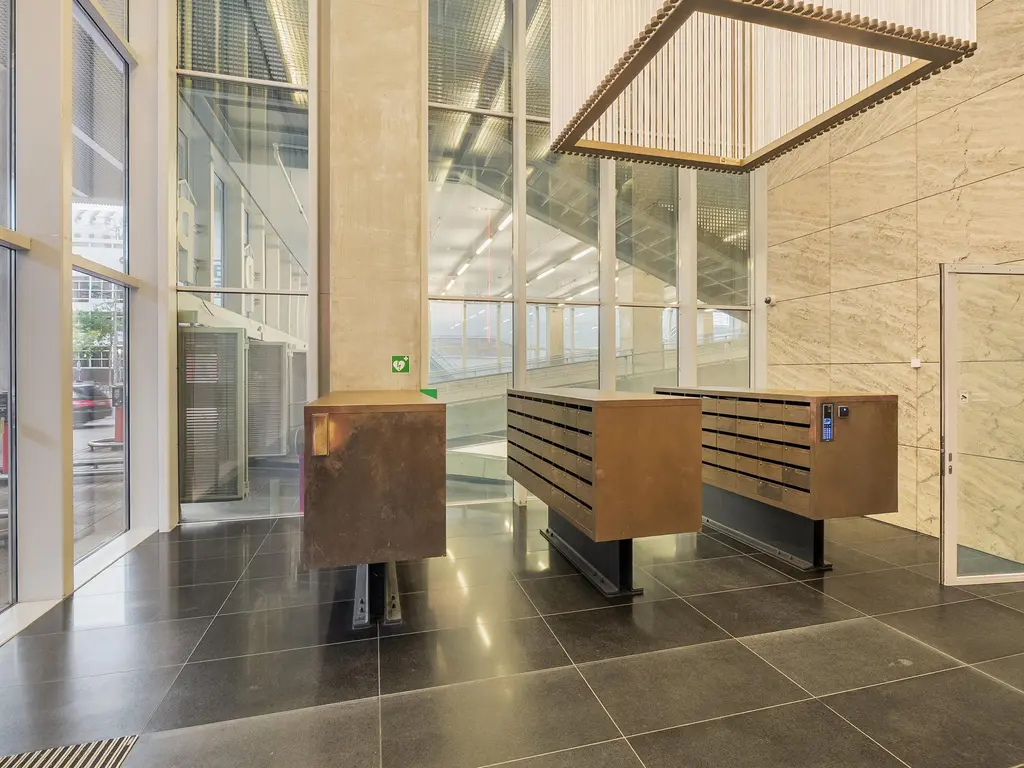Entree met video-intercomsysteem. Gesloten centrale hal met receptionist, 3 snelle liften en trappenhuis.