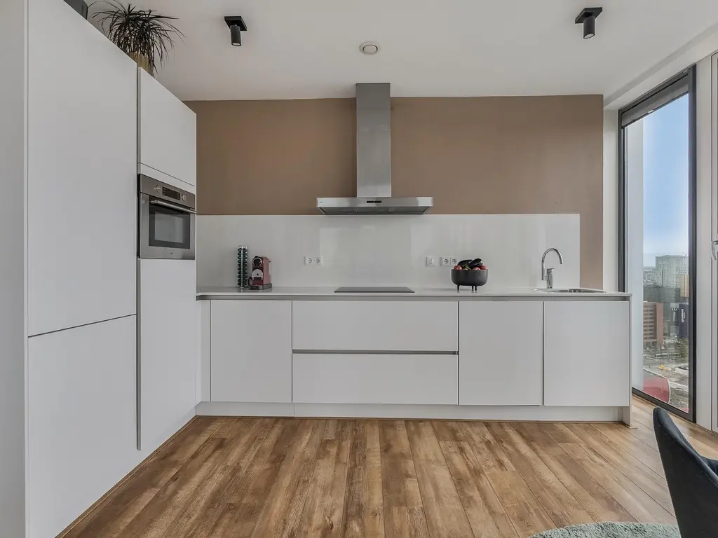 Sfeervolle lichte living (ca. 37 m²) voorzien van een lichte laminaatvloer met vloerverwarming en koeling systeem. Wonen op de 22e verdieping betekent elke dag beginnen en eindigen met een adembenemend uitzicht vanuit de royale living. Grote raampartijen zorgen voor een overvloed aan natuurlijk licht en een ruimtelijk gevoel. Middels de living heeft u toegang tot het royale balkon.