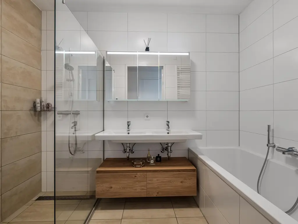Moderne badkamer 1 (ca. 6 m²) met sanitaire voorzieningen zoals dubbele wastafels met wastafelmeubel, spiegel met spiegelkast en verlichting, ligbad, inloopdouche en designradiator. Deze badkamer is geheel betegeld met witte wandtegels, en een lichtgrijze tegelvloer afgewerkt met vloerverwarming en koeling systeem.