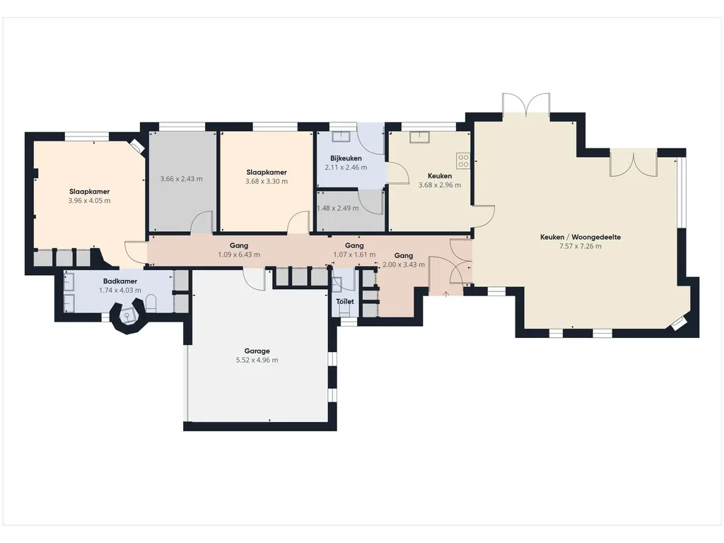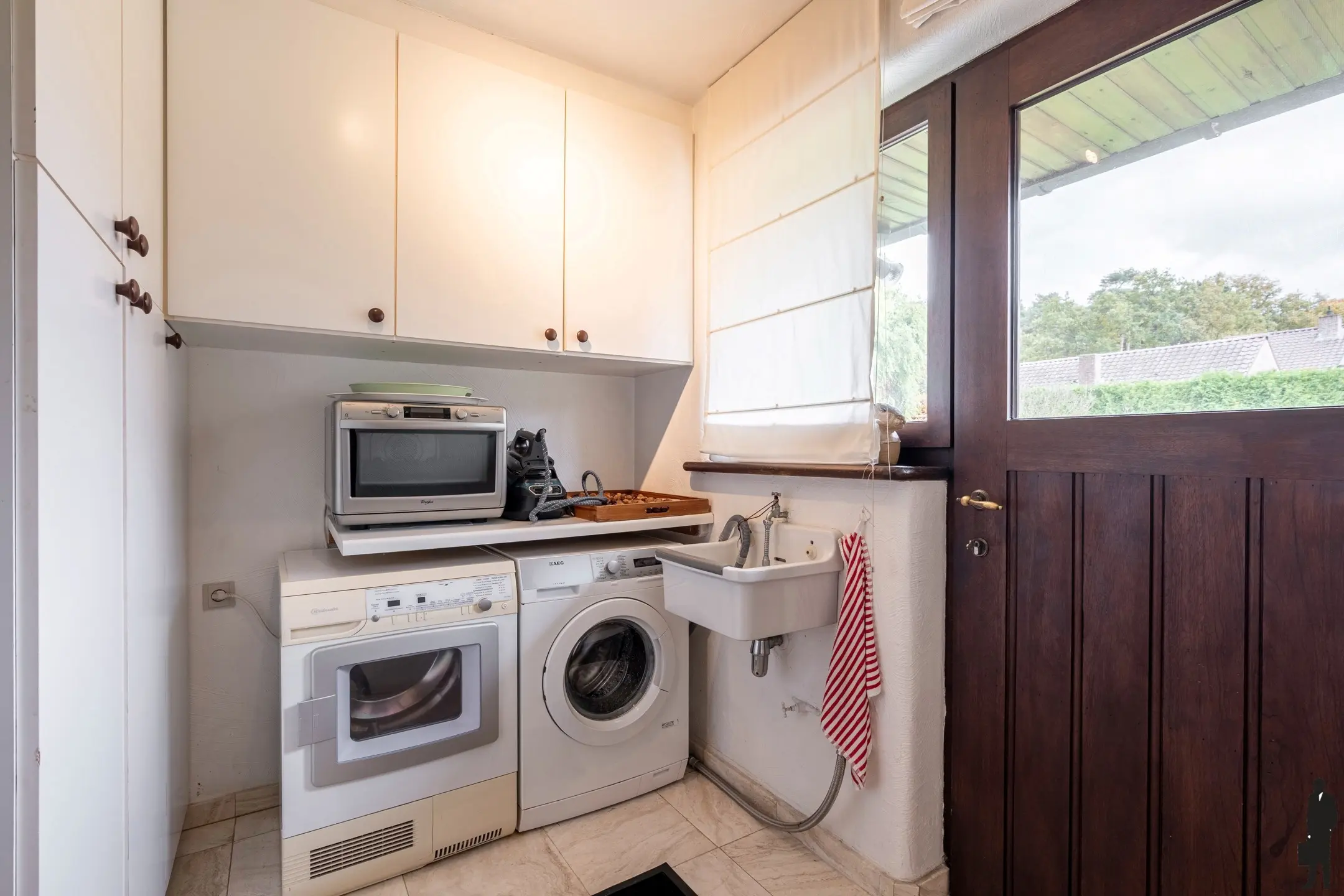 Aan de keuken bevindt zich een bijkeuken die fungeert als tussenhal naar de tuin.